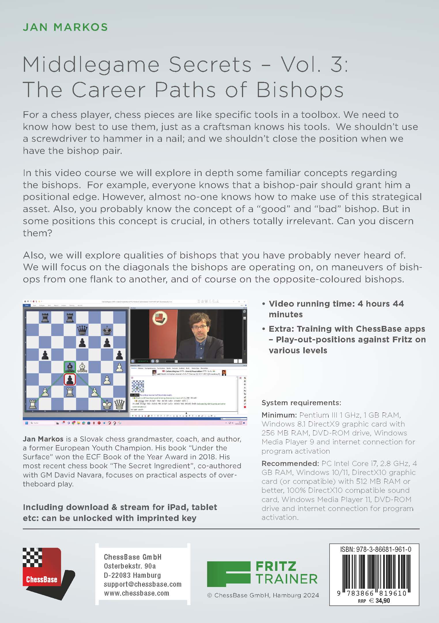 For a chess player, chess pieces are like specific tools in a toolbox. We need to know how best to use them, just as a craftsman knows his tools. We shouldn't use a screwdriver to hammer in a nail; and we shouldn't close the position when we have the bishop pair.In this video course we will explore in depth some familiar concepts regarding the bishops. For example, everyone knows that a bishop-pair should grant him a positional edge. However, almost no-one knows how to make use of this strategical asset. Also, you probably know the concept of a "good" and "bad" bishop. But insome positions this concept is crucial, in others totally irrelevant. Can you discern them?Also, we will explore qualities of bishops that you have probably never heard of. We will focus on the diagonals the bishops are operating on, on maneuvers of bishops from one flank to another, and of course on the opposite-coloured bishops.- Video running time: 4 hours 44 minutes- Extra: Training with ChessBase apps - Play-out-positions against Fritz on various levelsIncluding download & stream for iPad, tablet etc: can be unlocked with imprinted keySystem requirements: Minimum: Pentium III 1 GHz, 1 GB RAM, Windows 8.1, DirectX9 graphic card with 256 MB RAM, DVD-ROM drive, Windows Media Player 9 and internet connection for program activation. Recommended: PC Intel Core i7, 2.8 GHz, 4 GB RAM, Windows 10 or 11 , DirectX10 graphic card (or compatible) with 512 MB RAM or better, 100% DirectX10 compatible sound card, Windows Media Player 11, DVDROM drive and internet connection for program activation.