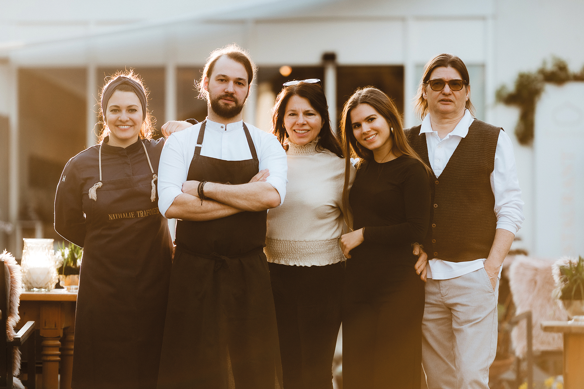 In origine commessa in negozi di prodotti alimentari e di moda, Sonya era anche un'assidua frequentatrice dei circuiti da gara. La sua famiglia era titolare di un'officina meccanica ad Eyrs, il suo paese natio: è così che è nata la sua passione per corse e motori. Dopo essersi trasferita per amore a Castelbello, insieme al marito, ha trasformato il ristorante Kuppelrain in ciò che è oggi. Nel 2022, è stata la prima donna in Italia a ottenere il Michelin Sommelier Award. Essendo nata 14 e 16 anni dopo i suoi fratelli, Giulya è la "piccola" del Kuppelrain. Dopo il diploma al liceo linguistico nel 2024, collabora con impegno nell'azienda di famiglia e nella cura di galline e gatti. Oltre agli studi, non trascura mai il suo prezioso lavoro al Kuppelrain. Avendo ereditato la passione per il vino da mamma Sonya, vorrebbe farne una professione per il futuro, prendendo un domani il suo posto. Dopo aver viaggiato in tutto il mondo per diversi anni - durante i quali ha maturato numerose esperienze in moltissime cucine - nel 1988 Jörg ha rilevato il vecchio e un po' fatiscente "Kuppelrain", partendo da zero. Con molto lavoro, una cucina di qualità e una grande determinazione, insieme alla moglie Sonya, ha trasformato il ristorante in ciò che è oggi. La stella Michelin ottenuta nel 2001 è stata confermata anno dopo anno, prima da lui stesso e ora dal figlio Kevin. Dopo essersi diplomato in grafica e design a Merano, Kevin ha iniziato un apprendistato di tre anni in cucina presso il "Grödner Hof" di Ortisei, per poi collaborare in Svizzera con lo chef stellato Andreas Caminada, premiato con tre stelle Michelin. Da diversi anni, difende con successo la stella Michelin ottenuta dal ristorante "Kuppelrain". Una volta diplomata al liceo linguistico, Nathalie ha completato l'apprendistato come pasticcera presso il "Café König" di Merano, oltre che uno stage in Svizzera e presso il "Café Merz" di Coira. A Bruxelles ha lavorato con il maestro Laurent Gerbaud - considerato forza trainante di una nuova generazione di cioccolatieri belgi - con la famiglia Ingelbrecht e presso "Le Saint-Aulaye". Al "Kuppelrain", è responsabile della pasticceria, delle dolci delizie e delle creazioni di cioccolato. Oltre a essere un'esperta erborista certificata FNL, ha completato il corso di raccolta di erbe selvatiche presso la Scuola superiore Laimburg: ciò si traduce in una lavorazione competente di erbe e bacche naturali.