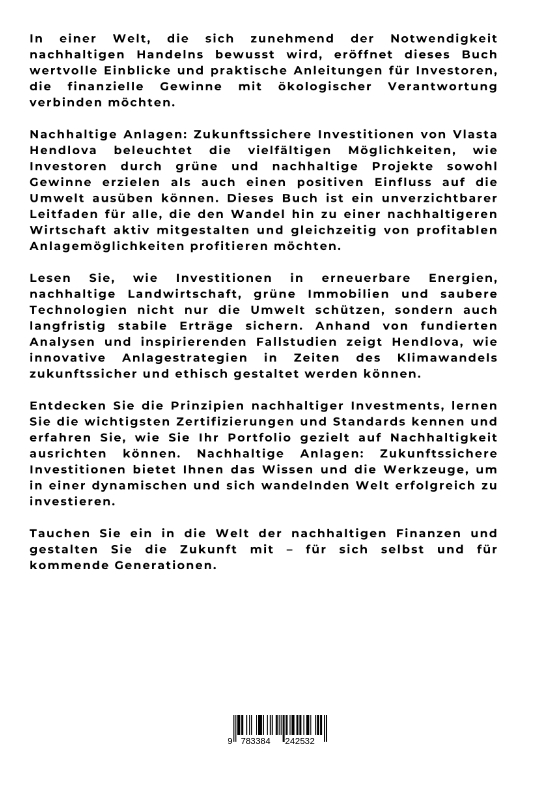 In einer Welt, die sich zunehmend der Notwendigkeit nachhaltigen Handelns bewusst wird, eröffnet dieses Buch wertvolle Einblicke und praktische Anleitungen für Investoren, die finanzielle Gewinne mit ökologischer Verantwortung verbinden möchten.Nachhaltige Anlagen: Zukunftssichere Investitionen von Vlasta Hendlova beleuchtet die vielfältigen Möglichkeiten, wie Investoren durch grüne und nachhaltige Projekte sowohl Gewinne erzielen als auch einen positiven Einfluss auf die Umwelt ausüben können. Dieses Buch ist ein unverzichtbarer Leitfaden für alle, die den Wandel hin zu einer nachhaltigeren Wirtschaft aktiv mitgestalten und gleichzeitig von profitablen Anlagemöglichkeiten profitieren möchten.Lesen Sie, wie Investitionen in erneuerbare Energien, nachhaltige Landwirtschaft, grüne Immobilien und saubere Technologien nicht nur die Umwelt schützen, sondern auch langfristig stabile Erträge sichern. Anhand von fundierten Analysen und inspirierenden Fallstudien zeigt Hendlova, wie innovative Anlagestrategien in Zeiten des Klimawandels zukunftssicher und ethisch gestaltet werden können.Entdecken Sie die Prinzipien nachhaltiger Investments, lernen Sie die wichtigsten Zertifizierungen und Standards kennen und erfahren Sie, wie Sie Ihr Portfolio gezielt auf Nachhaltigkeit ausrichten können. Nachhaltige Anlagen: Zukunftssichere Investitionen bietet Ihnen das Wissen und die Werkzeuge, um in einer dynamischen und sich wandelnden Welt erfolgreich zu investieren.Tauchen Sie ein in die Welt der nachhaltigen Finanzen und gestalten Sie die Zukunft mit - für sich selbst und für kommende Generationen.