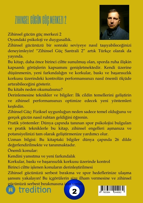 Zihinsel gücün güç merkezi 2Oyundaki psikoloji ve duygusallik.Zihinsel gücünüzü bir sonraki seviyeye nasil tasiyabileceginizi deneyimleyin! "Zihinsel Güç Santrali 2" artik Türkçe olarak da yayinda.Bu kitap, daha önce birinci ciltte sunulmus olan, sporda ruha iliskin kapsamli görüslerin kapsamini genisletmektedir. Kendi üzerine düsünmenin, yeni farkindaligin ve korkular, baski ve basarisizlik korkusu üzerindeki kontrolün performansinizi nasil önemli ölçüde artirabilecegini gösterir.Bu kitabi neden okumalisiniz?Derinlemesine teknikler ve bilgiler: Ilk cildin temellerini gelistirin ve zihinsel performansinizi optimize edecek yeni yöntemleri kesfedin.Zihinsel Güç: Fiziksel uygunlugun neden sadece temel oldugunu ve gerçek gücün nasil ruhtan geldigini ögrenin.Pratik yöntemler: Dünya çapinda taninan spor psikolojisi bulgulari ve pratik tekniklerle bu kitap, zihinsel engelleri asmaniza ve potansiyelinizi tam olarak gelistirmenize yardimci olur.Uzman bilgisi: Bu kitaptaki bilgiler dünya çapinda 26 dilde degerlendirilmekte ve taninmaktadir.Önemli konular:Kendini yansitma ve yeni farkindalikKorkular, baski ve basarisizlik korkusu üzerinde kontrolBirinci ciltte islenen konularin derinlestirilmesiZihinsel gücünüzü serbest birakma ve spor hedeflerinize ulasma sansini yakalayin! Bu içgörülerin size ilham vermesine ve zihinsel gücünüzü serbest birakmasina izin verin.