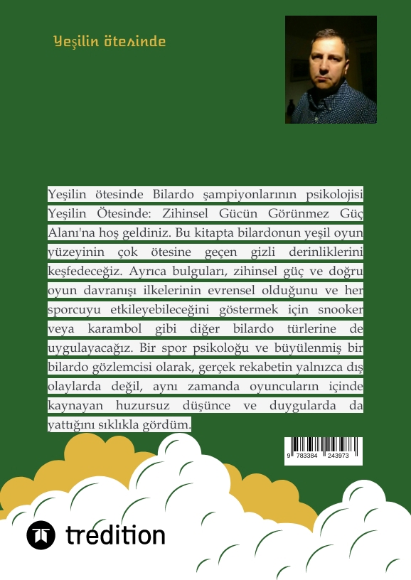 Yesilin Ötesinde: Bilardo Sampiyonlarinin PsikolojisiYesilin Ötesinde: Zihinsel Gücün Görünmez Güç Alani'na hos geldiniz. Bu kitapta bilardonun yesil oyun yüzeyinin çok ötesine geçen gizli derinliklerini kesfedecegiz. Ayrica bulgulari, zihinsel güç ve dogru oyun davranisi ilkelerinin evrensel oldugunu ve her sporcuyu etkileyebilecegini göstermek için snooker veya karambol gibi diger bilardo türlerine de uygulayacagiz.Bir spor psikologu ve büyülenmis bir bilardo gözlemcisi olarak, gerçek rekabetin yalnizca dis olaylarda degil, ayni zamanda oyuncularin içinde kaynayan huzursuz düsünce ve duygularda da yattigini siklikla gördüm. Bu kitapta bilardo sampiyonlarinin zihinsel güçlerini en üst düzeye çikarmak ve performanslarini yeni seviyelere çikarmak için kullandiklari psikolojik zorluklari ve teknikleri inceleyecegiz.Asagidakiler de dahil olmak üzere zihinsel hazirligin çesitli yönlerine bakacagiz:Öz-düsünüm ve farkindalik: Oyuncular, derin öz-düsünüm yoluyla iç tikanikliklarini nasil taniyabilir ve asabilirler?Korkular ve baski üzerinde kontrol: Zafer ile yenilgi arasindaki farki yaratabilecek performans baskisiyla ve basarisizlik korkusuyla basa çikma stratejileri.Duygusal Düzenleme: Olumsuz duygulari kontrol etme ve onlari pozitif enerjiye dönüstürme teknikleri.Konsantrasyon ve Odaklanma: Yogun rekabet sirasinda konsantrasyonu artirma ve odaklanmayi sürdürme yöntemleri.Görsellestirme ve zihinsel egzersizler: Performansi ve özgüveni artirmak için görsellestirme ve rahatlama tekniklerinin kullanilmasi.Basarili bilardo oyunculari ve antrenörleriyle yapilan gerçek vaka çalismalarini ve röportajlari analiz ederek bu tekniklerin pratik uygulamalarini gösterecegim. Bu bilgiler yalnizca bilardo oyunculari için degil ayni zamanda diger spor dallarindaki sporcular için de önemli olan degerli dersler sagliyor. Çünkü bilardoda gelistirilen zihinsel güç, her türlü spor baglaminda belirleyici bir avantaj saglayabilir."Yesilin Ötesinde"nde sahadaki basarinin çogu zaman oyuncunun kafasinda basladigi açikça görülüyor. Bu kitap, hem bilardoda hem de yasamda zihinsel gücünü gelistirmek ve tam potansiyeline ulasmak isteyen herkes için vazgeçilmez bir rehberdir.