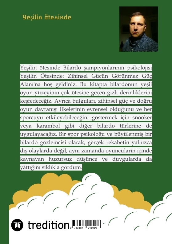 Yesilin Ötesinde: Bilardo Sampiyonlarinin PsikolojisiYesilin Ötesinde: Zihinsel Gücün Görünmez Güç Alani'na hos geldiniz. Bu kitapta bilardonun yesil oyun yüzeyinin çok ötesine geçen gizli derinliklerini kesfedecegiz. Ayrica bulgulari, zihinsel güç ve dogru oyun davranisi ilkelerinin evrensel oldugunu ve her sporcuyu etkileyebilecegini göstermek için snooker veya karambol gibi diger bilardo türlerine de uygulayacagiz.Bir spor psikologu ve büyülenmis bir bilardo gözlemcisi olarak, gerçek rekabetin yalnizca dis olaylarda degil, ayni zamanda oyuncularin içinde kaynayan huzursuz düsünce ve duygularda da yattigini siklikla gördüm. Bu kitapta bilardo sampiyonlarinin zihinsel güçlerini en üst düzeye çikarmak ve performanslarini yeni seviyelere çikarmak için kullandiklari psikolojik zorluklari ve teknikleri inceleyecegiz.Asagidakiler de dahil olmak üzere zihinsel hazirligin çesitli yönlerine bakacagiz:Öz-düsünüm ve farkindalik: Oyuncular, derin öz-düsünüm yoluyla iç tikanikliklarini nasil taniyabilir ve asabilirler?Korkular ve baski üzerinde kontrol: Zafer ile yenilgi arasindaki farki yaratabilecek performans baskisiyla ve basarisizlik korkusuyla basa çikma stratejileri.Duygusal Düzenleme: Olumsuz duygulari kontrol etme ve onlari pozitif enerjiye dönüstürme teknikleri.Konsantrasyon ve Odaklanma: Yogun rekabet sirasinda konsantrasyonu artirma ve odaklanmayi sürdürme yöntemleri.Görsellestirme ve zihinsel egzersizler: Performansi ve özgüveni artirmak için görsellestirme ve rahatlama tekniklerinin kullanilmasi.Basarili bilardo oyunculari ve antrenörleriyle yapilan gerçek vaka çalismalarini ve röportajlari analiz ederek bu tekniklerin pratik uygulamalarini gösterecegim. Bu bilgiler yalnizca bilardo oyunculari için degil ayni zamanda diger spor dallarindaki sporcular için de önemli olan degerli dersler sagliyor. Çünkü bilardoda gelistirilen zihinsel güç, her türlü spor baglaminda belirleyici bir avantaj saglayabilir."Yesilin Ötesinde"nde sahadaki basarinin çogu zaman oyuncunun kafasinda basladigi açikça görülüyor. Bu kitap, hem bilardoda hem de yasamda zihinsel gücünü gelistirmek ve tam potansiyeline ulasmak isteyen herkes için vazgeçilmez bir rehberdir.