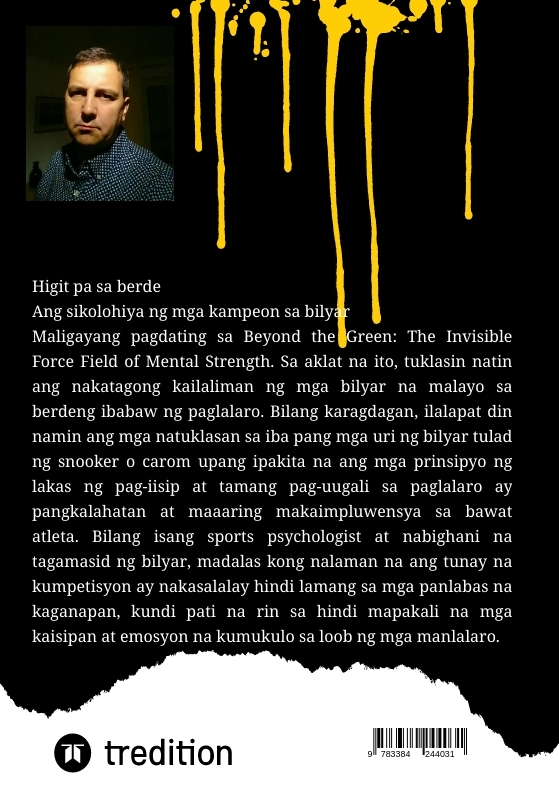 Beyond the Green: The Psychology of Billiards ChampionsMaligayang pagdating sa Beyond the Green: The Invisible Force Field of Mental Strength. Sa aklat na ito, tuklasin natin ang nakatagong kailaliman ng mga bilyar na malayo sa berdeng ibabaw ng paglalaro. Bilang karagdagan, ilalapat din namin ang mga natuklasan sa iba pang mga uri ng bilyar tulad ng snooker o carom upang ipakita na ang mga prinsipyo ng lakas ng pag-iisip at tamang pag-uugali sa paglalaro ay pangkalahatan at maaaring makaimpluwensya sa bawat atleta.Bilang isang sports psychologist at nabighani na tagamasid ng bilyar, madalas kong nalaman na ang tunay na kumpetisyon ay namamalagi hindi lamang sa mga panlabas na kaganapan, kundi pati na rin sa hindi mapakali na mga kaisipan at emosyon na kumukulo sa loob ng mga manlalaro. Sa aklat na ito, tuklasin natin ang mga sikolohikal na hamon at diskarte na ginagamit ng mga kampeon sa bilyar upang mapakinabangan ang kanilang lakas ng pag-iisip at dalhin ang kanilang pagganap sa mga bagong antas.Titingnan natin ang iba't ibang aspeto ng paghahanda sa isip kabilang ang:Pagmumuni-muni sa sarili at kamalayan: Paano makikilala at malalampasan ng mga manlalaro ang kanilang mga panloob na pagbara sa pamamagitan ng malalim na pagmumuni-muni sa sarili.Kontrol sa mga takot at pressure: Mga diskarte para sa pagharap sa pressure na gumanap at takot sa pagkabigo na maaaring gumawa ng pagkakaiba sa pagitan ng tagumpay at pagkatalo.Emosyonal na Regulasyon: Mga diskarte upang kontrolin ang mga negatibong emosyon at ibahin ang mga ito sa positibong enerhiya.Konsentrasyon at Pokus: Mga pamamaraan para sa pagpapabuti ng konsentrasyon at pagpapanatili ng pokus sa panahon ng matinding kompetisyon.Visualization at mental exercises: Ang paggamit ng visualization at relaxation techniques para mapabuti ang performance at tiwala sa sarili.Sa pamamagitan ng pagsusuri sa mga tunay na pag-aaral ng kaso at mga panayam sa mga matagumpay na manlalaro ng bilyar at coach, ipapakita ko ang mga praktikal na aplikasyon ng mga diskarteng ito. Ang mga insight na ito ay nagbibigay ng mahahalagang aral na may kaugnayan hindi lamang sa mga manlalaro ng bilyar, kundi pati na rin sa mga atleta sa iba pang sports. Dahil ang lakas ng pag-iisip na nabuo sa bilyar ay maaaring magbigay ng mapagpasyang kalamangan sa anumang konteksto ng palakasan.Sa "Beyond the Green" nagiging malinaw na ang tagumpay sa larangan ay madalas na nagsisimula sa ulo ng manlalaro. Ang aklat na ito ay isang mahalagang gabay para sa sinumang gustong paunlarin ang kanilang lakas ng kaisipan at maabot ang kanilang buong potensyal - kapwa sa bilyar at sa buhay.