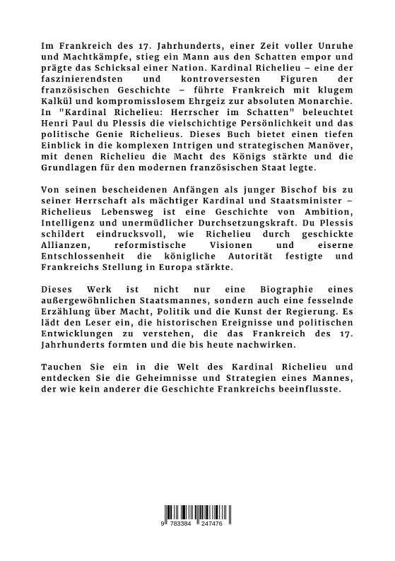 Im Frankreich des 17. Jahrhunderts, einer Zeit voller Unruhe und Machtkämpfe, stieg ein Mann aus den Schatten empor und prägte das Schicksal einer Nation. Kardinal Richelieu - eine der faszinierendsten und kontroversesten Figuren der französischen Geschichte - führte Frankreich mit klugem Kalkül und kompromisslosem Ehrgeiz zur absoluten Monarchie.In "Kardinal Richelieu: Herrscher im Schatten" beleuchtet Henri Paul du Plessis die vielschichtige Persönlichkeit und das politische Genie Richelieus. Dieses Buch bietet einen tiefen Einblick in die komplexen Intrigen und strategischen Manöver, mit denen Richelieu die Macht des Königs stärkte und die Grundlagen für den modernen französischen Staat legte.Von seinen bescheidenen Anfängen als junger Bischof bis zu seiner Herrschaft als mächtiger Kardinal und Staatsminister - Richelieus Lebensweg ist eine Geschichte von Ambition, Intelligenz und unermüdlicher Durchsetzungskraft. Du Plessis schildert eindrucksvoll, wie Richelieu durch geschickte Allianzen, reformistische Visionen und eiserne Entschlossenheit die königliche Autorität festigte und Frankreichs Stellung in Europa stärkte.Dieses Werk ist nicht nur eine Biographie eines außergewöhnlichen Staatsmannes, sondern auch eine fesselnde Erzählung über Macht, Politik und die Kunst der Regierung. Es lädt den Leser ein, die historischen Ereignisse und politischen Entwicklungen zu verstehen, die das Frankreich des 17. Jahrhunderts formten und die bis heute nachwirken.Tauchen Sie ein in die Welt des Kardinal Richelieu und entdecken Sie die Geheimnisse und Strategien eines Mannes, der wie kein anderer die Geschichte Frankreichs beeinflusste.