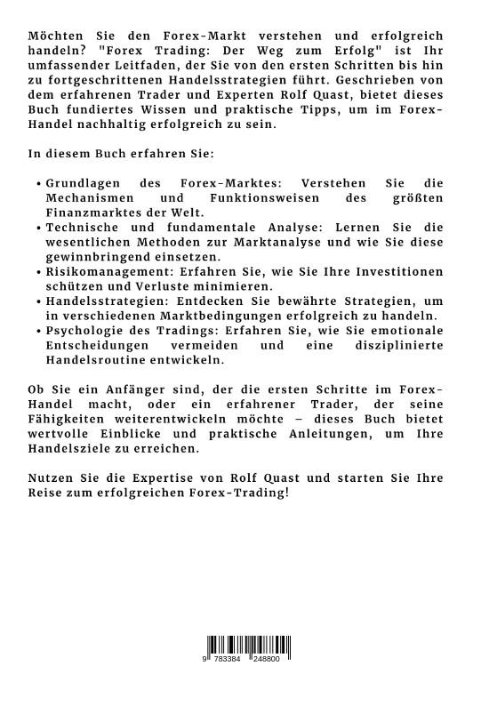 Möchten Sie den Forex-Markt verstehen und erfolgreich handeln? "Forex Trading: Der Weg zum Erfolg" ist Ihr umfassender Leitfaden, der Sie von den ersten Schritten bis hin zu fortgeschrittenen Handelsstrategien führt. Geschrieben von dem erfahrenen Trader und Experten Rolf Quast, bietet dieses Buch fundiertes Wissen und praktische Tipps, um im Forex-Handel nachhaltig erfolgreich zu sein.In diesem Buch erfahren Sie:* Grundlagen des Forex-Marktes: Verstehen Sie die Mechanismen und Funktionsweisen des größten Finanzmarktes der Welt.* Technische und fundamentale Analyse: Lernen Sie die wesentlichen Methoden zur Marktanalyse und wie Sie diese gewinnbringend einsetzen.* Risikomanagement: Erfahren Sie, wie Sie Ihre Investitionen schützen und Verluste minimieren.* Handelsstrategien: Entdecken Sie bewährte Strategien, um in verschiedenen Marktbedingungen erfolgreich zu handeln.* Psychologie des Tradings: Erfahren Sie, wie Sie emotionale Entscheidungen vermeiden und eine disziplinierte Handelsroutine entwickeln.Ob Sie ein Anfänger sind, der die ersten Schritte im Forex-Handel macht, oder ein erfahrener Trader, der seine Fähigkeiten weiterentwickeln möchte - dieses Buch bietet wertvolle Einblicke und praktische Anleitungen, um Ihre Handelsziele zu erreichen.Nutzen Sie die Expertise von Rolf Quast und starten Sie Ihre Reise zum erfolgreichen Forex-Trading!