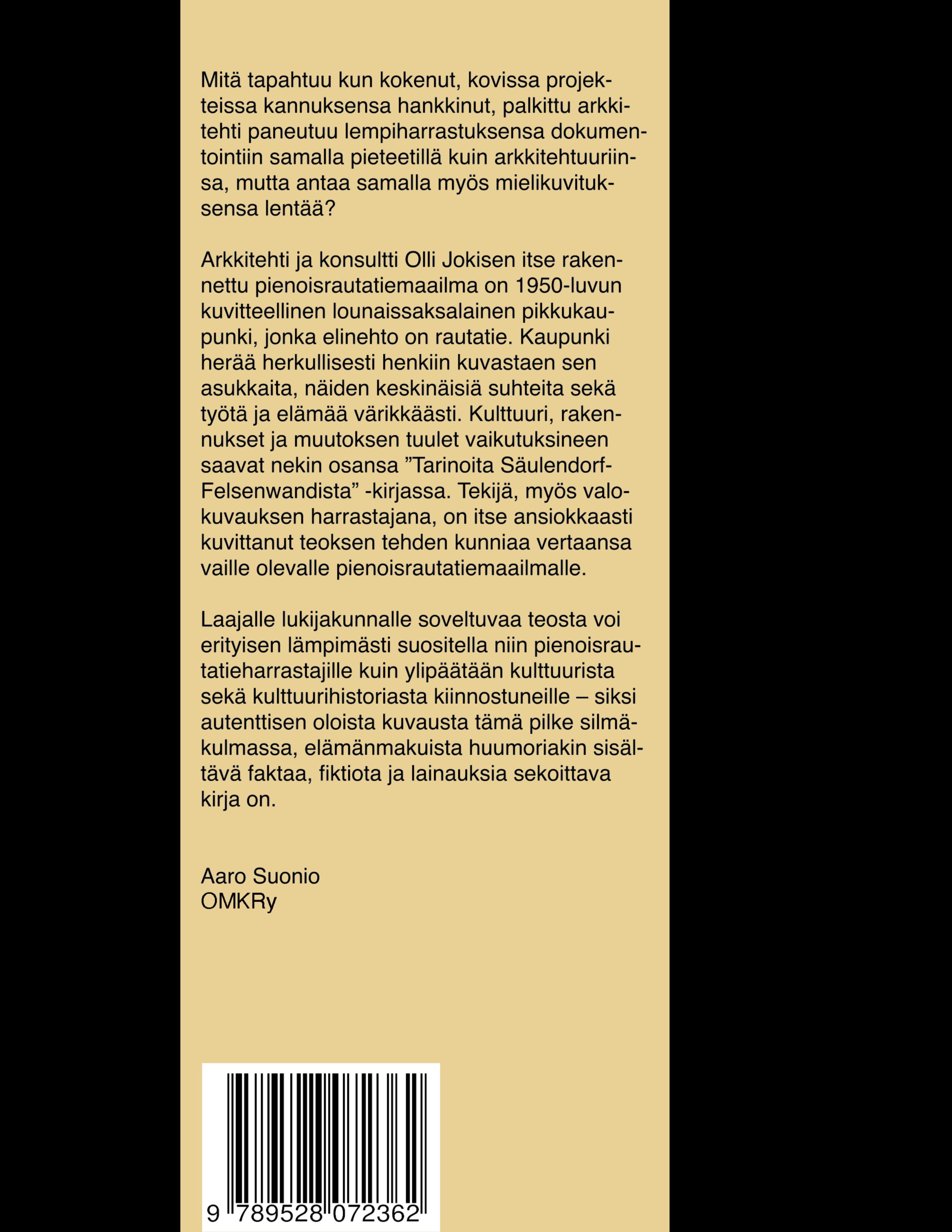 Arkkitehti ja konsultti Olli Jokisen itse rakennettu pienoisrautatiemaailma on 1950-luvun kuvitteellinen lounaissaksalainen pikkukaupunki, jonka elinehto on rautatie. Kaupunki herää herkullisesti henkiin kuvastaen sen asukkaita, näiden keskinäisiä suhteita sekä työtä ja elämää värikkäästi. Kulttuuri, rakennukset ja muutoksen tuulet vaikutuksineen saavat nekin osansa Tarinoita Säulendorf-Felsenwandista -kirjassa. Tekijä, myös valokuvauksen harrastajana, on itse ansiokkaasti kuvittanut teoksen tehden kunniaa vertaansa vaille olevalle pienoisrautatiemaailmalle.