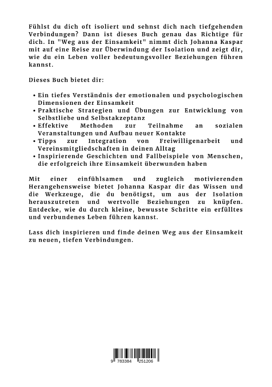 Fühlst du dich oft isoliert und sehnst dich nach tiefgehenden Verbindungen? Dann ist dieses Buch genau das Richtige für dich. In "Weg aus der Einsamkeit" nimmt dich Johanna Kaspar mit auf eine Reise zur Überwindung der Isolation und zeigt dir, wie du ein Leben voller bedeutungsvoller Beziehungen führen kannst.Dieses Buch bietet dir:* Ein tiefes Verständnis der emotionalen und psychologischen Dimensionen der Einsamkeit* Praktische Strategien und Übungen zur Entwicklung von Selbstliebe und Selbstakzeptanz* Effektive Methoden zur Teilnahme an sozialen Veranstaltungen und Aufbau neuer Kontakte* Tipps zur Integration von Freiwilligenarbeit und Vereinsmitgliedschaften in deinen Alltag* Inspirierende Geschichten und Fallbeispiele von Menschen, die erfolgreich ihre Einsamkeit überwunden habenMit einer einfühlsamen und zugleich motivierenden Herangehensweise bietet Johanna Kaspar dir das Wissen und die Werkzeuge, die du benötigst, um aus der Isolation herauszutreten und wertvolle Beziehungen zu knüpfen. Entdecke, wie du durch kleine, bewusste Schritte ein erfülltes und verbundenes Leben führen kannst.Lass dich inspirieren und finde deinen Weg aus der Einsamkeit zu neuen, tiefen Verbindungen.