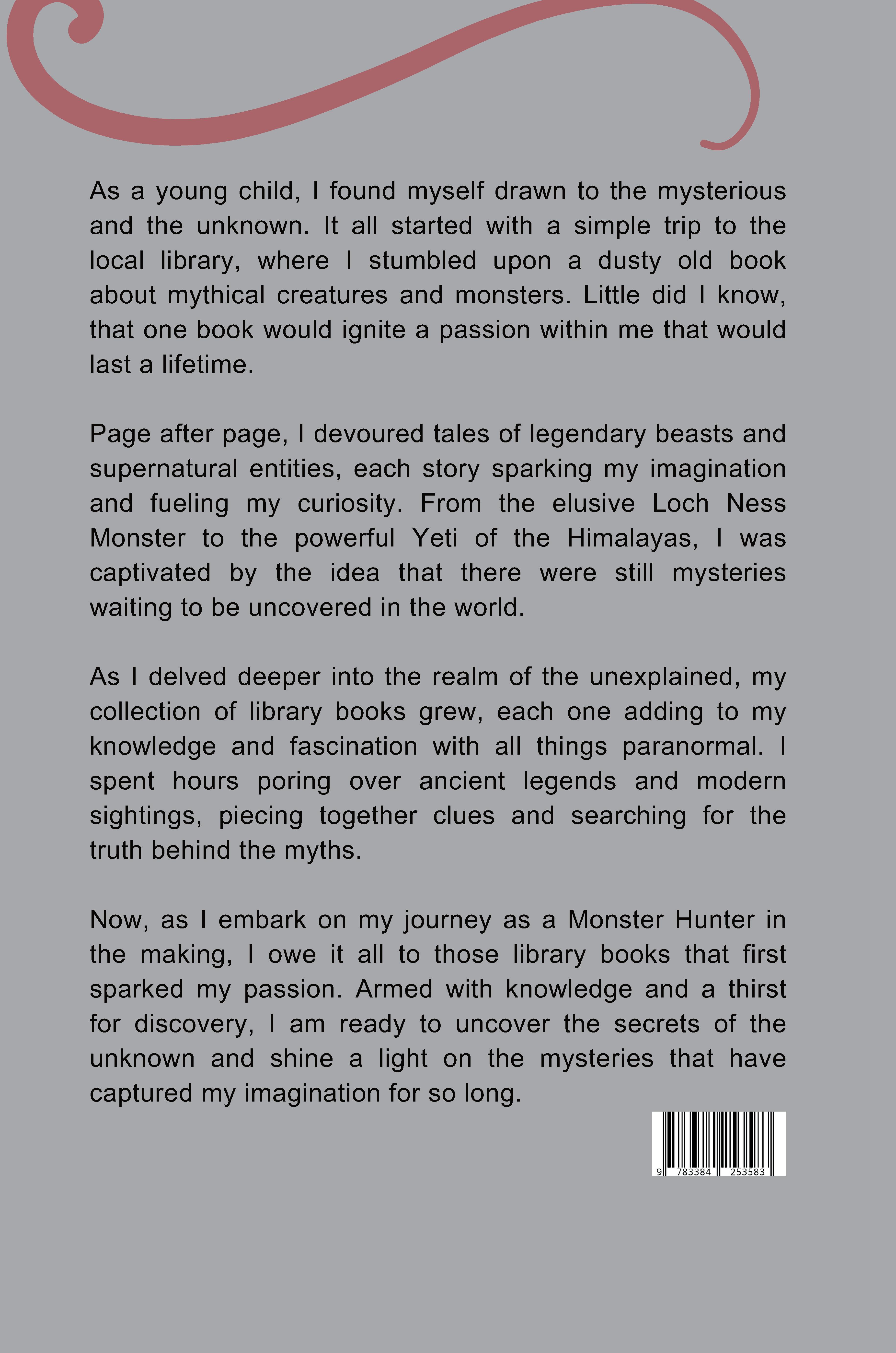 While Dr. Catherine's title suggests a more academic background, the book title "From Library Books to Real-Life Hunts: My Obsession with Unexplained Creatures" leans towards a more personal and adventurous exploration. Here's a vita option that reflects that tone: Ava Blake is a lifelong adventurer and cryptozoology enthusiast. Her fascination with mythical creatures began in dusty library stacks, devouring every book on folklore and legendary beasts. This childhood passion ignited a fire within her, leading Ava to transform from bookworm to cryptozoology investigator. "From Library Books to Real-Life Hunts: My Obsession with Unexplained Creatures" chronicles Ava's captivating journey from armchair explorer to field researcher. Armed with unwavering curiosity and a healthy dose of skepticism, Ava embarks on expeditions to remote locations, chasing rumors of elusive creatures whispered about in local legends. Ava's passion extends beyond the thrill of the hunt. She is a captivating storyteller who shares her experiences through engaging lectures, online forums, and her popular blog. Ava's infectious enthusiasm inspires others to embrace the mystery of the unknown and to keep an open mind to the possibilities that lurk just beyond the edges of scientific knowledge. In "From Library Books to Real-Life Hunts," Ava invites readers on a thrilling adventure. She delves into the captivating world of cryptozoology, shares her personal encounters with the unexplained, and reignites the childlike wonder of peering into the shadows and questioning what might exist beyond the known. Ava's insightful and entertaining narrative leaves readers both questioning and hopeful, eager to join her on the ongoing quest to unravel the mysteries of the natural world.