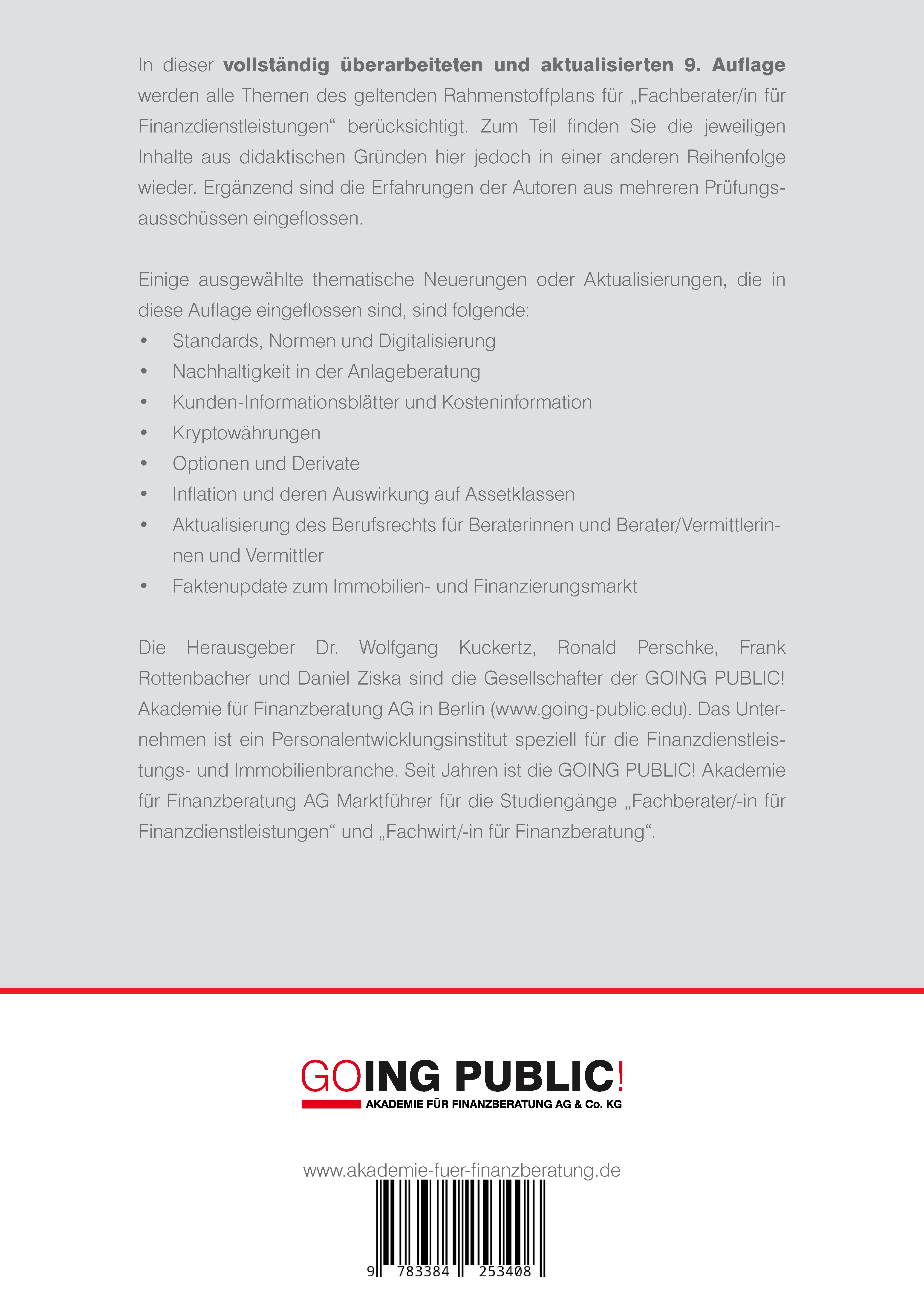 Ein Buch, das auf die IHK-Weiterbildungsprüfung "Fachberater/in für Finanzdienstleistun-gen" vorbereitet und gleichzeitig "Praxiswissen Finanzdienstleistungen" heißt - widerspricht sich das nicht?Dieses Buch zeigt Ihnen, dass dem nicht so ist:1.Der Rahmenstoffplan des in der Finanzdienstleistungsbranche etablierten, öffentlich-rechtlichen Weiterbildungsabschlusses "Fachberater/in für Finanzdienstleistungen" ist von vielen Praktikern erarbeitet worden. Dabei wurde auf eine hohe Praxisrelevanz der Inhalte geachtet und dem Allfinanzgedanken Rechnung getragen. Damit sind die In-halte äußerst aktuell und wichtig für jeden, der täglich mit Kunden umgeht und diese berät. Dadurch, dass sich die Inhalte dieses Buchs an dem Rahmenlehrplan orientie-ren, decken sie gleichzeitig sehr viele Themen der Beratungspraxis ab.2.Dieses Buch ist so geschrieben, dass Sie es sowohl zur gezielten Prüfungsvorberei-tung, als auch in der Praxis als ständigen Begleiter einsetzen können. Aufbauend auf unserer Erfahrung aus über drei Jahrzehnten in Schulungen und Seminaren für Ban-ken, Versicherungs-, Immobilien- und Vertriebsunternehmen von Finanzdienstleistun-gen, werden Ihnen in den einzelnen Kapiteln nicht nur die Produkte unternehmensun-abhängig erläutert, sondern auch rechtliche Grundlagen sowie wertvolle Tipps für die Praxis gegeben. Ein ausführliches Stichwortverzeichnis ermöglicht ein schnelles Auf-finden von Themengebieten.3.Die Herausgeber Dr. Wolfgang Kuckertz, Ronald Perschke und Frank Rottenbacher sind Vorstände der Berliner GOING PUBLlC! Akademie für Finanzberatung AG (www.akademie-fuer-finanzberatung.de), dem bundesweit führenden Anbieter von Vorbereitungsstudiengängen zum/-r "Fachberater/in für Finanzdienstleistungen (IHK)" sowie "Fachwirt/in für Finanzberatung (IHK)". Herr Daniel Ziska ist als Steuer-berater Vorstand der Berliner GPC Unternehmer- und Steuerberatungsgesellschaft AG, deren Mandantschaft ebenfalls schwerpunktmäßig aus dem Finanzdienstleis-tungsbereich kommt.