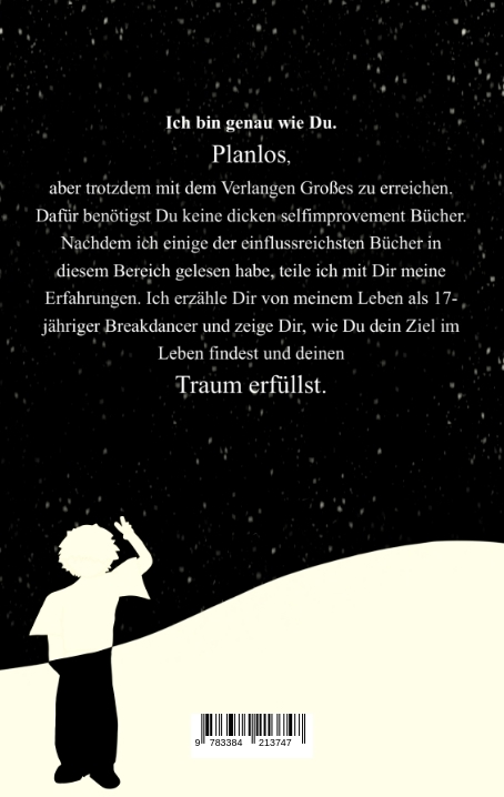 Ich bin genau wie Du. Planlos, aber trotzdem mit dem Verlangen Großes zu erreichen. Dafür benötigst Du keine dicken selfimprovement Bücher. Nachdem ich einige der einflussreichsten Bücher in diesem Bereich gelesen habe, teile ich mit Dir meine Erfahrungen. Ich erzähle Dir von meinem Leben als 17-jähriger Breakdancer und zeige Dir, wie Du dein Ziel im Leben findest und deinen Traum erfüllst.