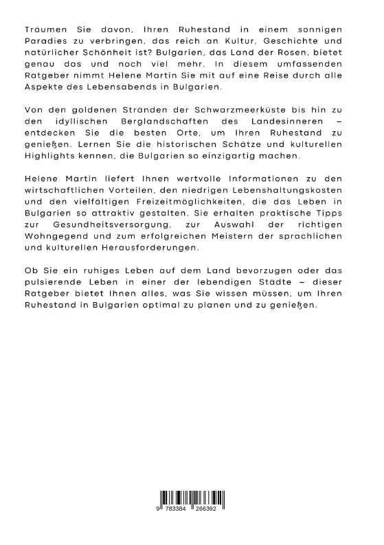 Träumen Sie davon, Ihren Ruhestand in einem sonnigen Paradies zu verbringen, das reich an Kultur, Geschichte und natürlicher Schönheit ist? Bulgarien, das Land der Rosen, bietet genau das und noch viel mehr. In diesem umfassenden Ratgeber nimmt Helene Martin Sie mit auf eine Reise durch alle Aspekte des Lebensabends in Bulgarien.Von den goldenen Stränden der Schwarzmeerküste bis hin zu den idyllischen Berglandschaften des Landesinneren - entdecken Sie die besten Orte, um Ihren Ruhestand zu genießen. Lernen Sie die historischen Schätze und kulturellen Highlights kennen, die Bulgarien so einzigartig machen.Helene Martin liefert Ihnen wertvolle Informationen zu den wirtschaftlichen Vorteilen, den niedrigen Lebenshaltungskosten und den vielfältigen Freizeitmöglichkeiten, die das Leben in Bulgarien so attraktiv gestalten. Sie erhalten praktische Tipps zur Gesundheitsversorgung, zur Auswahl der richtigen Wohngegend und zum erfolgreichen Meistern der sprachlichen und kulturellen Herausforderungen.Ob Sie ein ruhiges Leben auf dem Land bevorzugen oder das pulsierende Leben in einer der lebendigen Städte - dieser Ratgeber bietet Ihnen alles, was Sie wissen müssen, um Ihren Ruhestand in Bulgarien optimal zu planen und zu genießen.