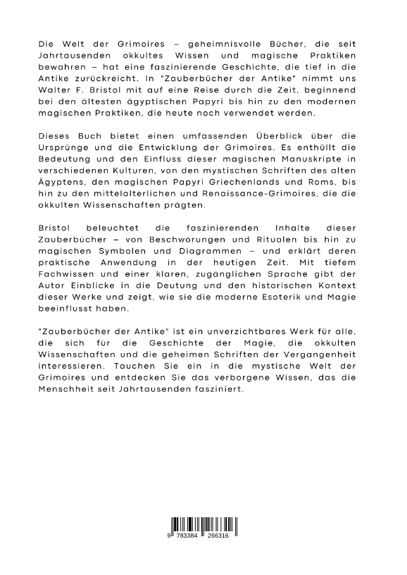 Die Welt der Grimoires - geheimnisvolle Bücher, die seit Jahrtausenden okkultes Wissen und magische Praktiken bewahren - hat eine faszinierende Geschichte, die tief in die Antike zurückreicht. In "Zauberbücher der Antike" nimmt uns Walter F. Bristol mit auf eine Reise durch die Zeit, beginnend bei den ältesten ägyptischen Papyri bis hin zu den modernen magischen Praktiken, die heute noch verwendet werden.Dieses Buch bietet einen umfassenden Überblick über die Ursprünge und die Entwicklung der Grimoires. Es enthüllt die Bedeutung und den Einfluss dieser magischen Manuskripte in verschiedenen Kulturen, von den mystischen Schriften des alten Ägyptens, den magischen Papyri Griechenlands und Roms, bis hin zu den mittelalterlichen und Renaissance-Grimoires, die die okkulten Wissenschaften prägten.Bristol beleuchtet die faszinierenden Inhalte dieser Zauberbücher - von Beschwörungen und Ritualen bis hin zu magischen Symbolen und Diagrammen - und erklärt deren praktische Anwendung in der heutigen Zeit. Mit tiefem Fachwissen und einer klaren, zugänglichen Sprache gibt der Autor Einblicke in die Deutung und den historischen Kontext dieser Werke und zeigt, wie sie die moderne Esoterik und Magie beeinflusst haben."Zauberbücher der Antike" ist ein unverzichtbares Werk für alle, die sich für die Geschichte der Magie, die okkulten Wissenschaften und die geheimen Schriften der Vergangenheit interessieren. Tauchen Sie ein in die mystische Welt der Grimoires und entdecken Sie das verborgene Wissen, das die Menschheit seit Jahrtausenden fasziniert.