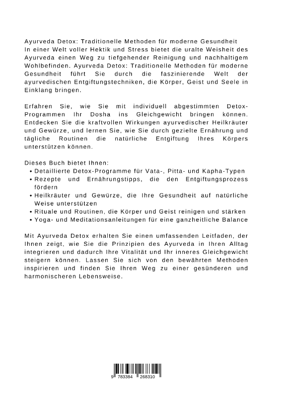 In einer Welt voller Hektik und Stress bietet die uralte Weisheit des Ayurveda einen Weg zu tiefgehender Reinigung und nachhaltigem Wohlbefinden. Ayurveda Detox: Traditionelle Methoden für moderne Gesundheit führt Sie durch die faszinierende Welt der ayurvedischen Entgiftungstechniken, die Körper, Geist und Seele in Einklang bringen.Erfahren Sie, wie Sie mit individuell abgestimmten Detox-Programmen Ihr Dosha ins Gleichgewicht bringen können. Entdecken Sie die kraftvollen Wirkungen ayurvedischer Heilkräuter und Gewürze, und lernen Sie, wie Sie durch gezielte Ernährung und tägliche Routinen die natürliche Entgiftung Ihres Körpers unterstützen können.Dieses Buch bietet Ihnen:- Detaillierte Detox-Programme für Vata-, Pitta- und Kapha-Typen- Rezepte und Ernährungstipps, die den Entgiftungsprozess fördern- Heilkräuter und Gewürze, die Ihre Gesundheit auf natürliche Weise unterstützen- Rituale und Routinen, die Körper und Geist reinigen und stärken- Yoga- und Meditationsanleitungen für eine ganzheitliche BalanceMit Ayurveda Detox erhalten Sie einen umfassenden Leitfaden, der Ihnen zeigt, wie Sie die Prinzipien des Ayurveda in Ihren Alltag integrieren und dadurch Ihre Vitalität und Ihr inneres Gleichgewicht steigern können. Lassen Sie sich von den bewährten Methoden inspirieren und finden Sie Ihren Weg zu einer gesünderen und harmonischeren Lebensweise.