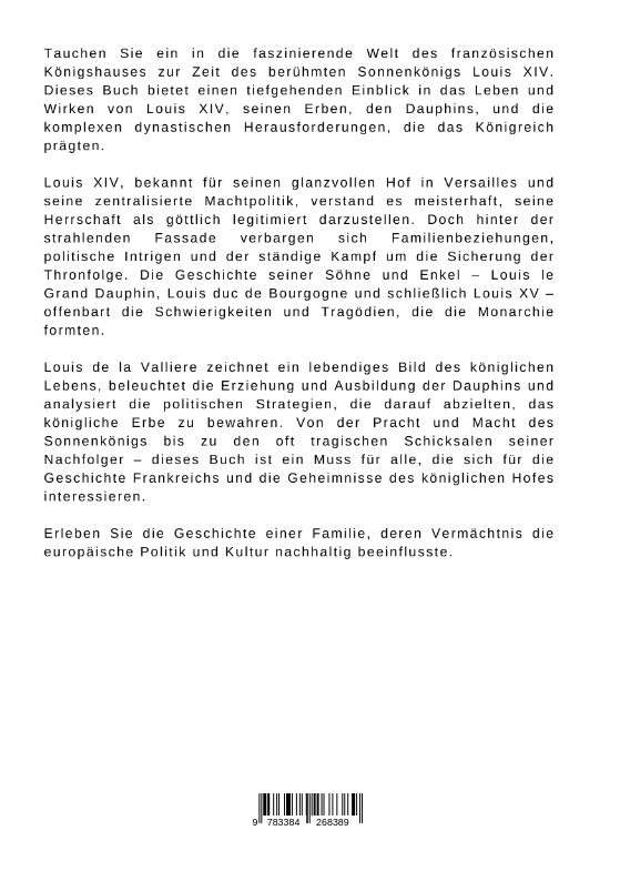 Tauchen Sie ein in die faszinierende Welt des französischen Königshauses zur Zeit des berühmten Sonnenkönigs Louis XIV. Dieses Buch bietet einen tiefgehenden Einblick in das Leben und Wirken von Louis XIV, seinen Erben, den Dauphins, und die komplexen dynastischen Herausforderungen, die das Königreich prägten.Louis XIV, bekannt für seinen glanzvollen Hof in Versailles und seine zentralisierte Machtpolitik, verstand es meisterhaft, seine Herrschaft als göttlich legitimiert darzustellen. Doch hinter der strahlenden Fassade verbargen sich Familienbeziehungen, politische Intrigen und der ständige Kampf um die Sicherung der Thronfolge. Die Geschichte seiner Söhne und Enkel - Louis le Grand Dauphin, Louis duc de Bourgogne und schließlich Louis XV - offenbart die Schwierigkeiten und Tragödien, die die Monarchie formten.Louis de la Valliere zeichnet ein lebendiges Bild des königlichen Lebens, beleuchtet die Erziehung und Ausbildung der Dauphins und analysiert die politischen Strategien, die darauf abzielten, das königliche Erbe zu bewahren. Von der Pracht und Macht des Sonnenkönigs bis zu den oft tragischen Schicksalen seiner Nachfolger - dieses Buch ist ein Muss für alle, die sich für die Geschichte Frankreichs und die Geheimnisse des königlichen Hofes interessieren.Erleben Sie die Geschichte einer Familie, deren Vermächtnis die europäische Politik und Kultur nachhaltig beeinflusste.