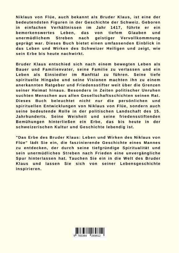 Niklaus von Flüe, auch bekannt als Bruder Klaus, ist eine der bedeutendsten Figuren in der Geschichte der Schweiz. Geboren in einfachen Verhältnissen im Jahr 1417, führte er ein bemerkenswertes Leben, das von tiefem Glauben und unermüdlichem Streben nach geistiger Vervollkommnung geprägt war. Dieses Buch bietet einen umfassenden Einblick in das Leben und Wirken des Schweizer Heiligen und zeigt, wie sein Erbe bis heute nachwirkt.Bruder Klaus entschied sich nach einem bewegten Leben als Bauer und Familienvater, seine Familie zu verlassen und ein Leben als Einsiedler im Ranfttal zu führen. Seine tiefe spirituelle Hingabe und seine Visionen machten ihn zu einem anerkannten Ratgeber und Friedensstifter weit über die Grenzen seiner Heimat hinaus. Besonders in Zeiten politischer Unruhen suchten Menschen aus allen Gesellschaftsschichten seinen Rat.Dieses Buch beleuchtet nicht nur die persönlichen und spirituellen Entwicklungen von Niklaus von Flüe, sondern auch seine bedeutende Rolle in der politischen Landschaft des 15. Jahrhunderts. Seine Weisheit und seine friedensstiftenden Bemühungen hinterließen ein Erbe, das bis heute in der schweizerischen Kultur und Geschichte lebendig ist."Das Erbe des Bruder Klaus: Leben und Wirken des Niklaus von Flüe" lädt Sie ein, die faszinierende Geschichte eines Mannes zu entdecken, der durch seine tiefgründige Spiritualität und sein unermüdliches Streben nach Frieden eine unvergängliche Spur hinterlassen hat. Tauchen Sie ein in die Welt des Bruder Klaus und lassen Sie sich von seiner Lebensgeschichte inspirieren.