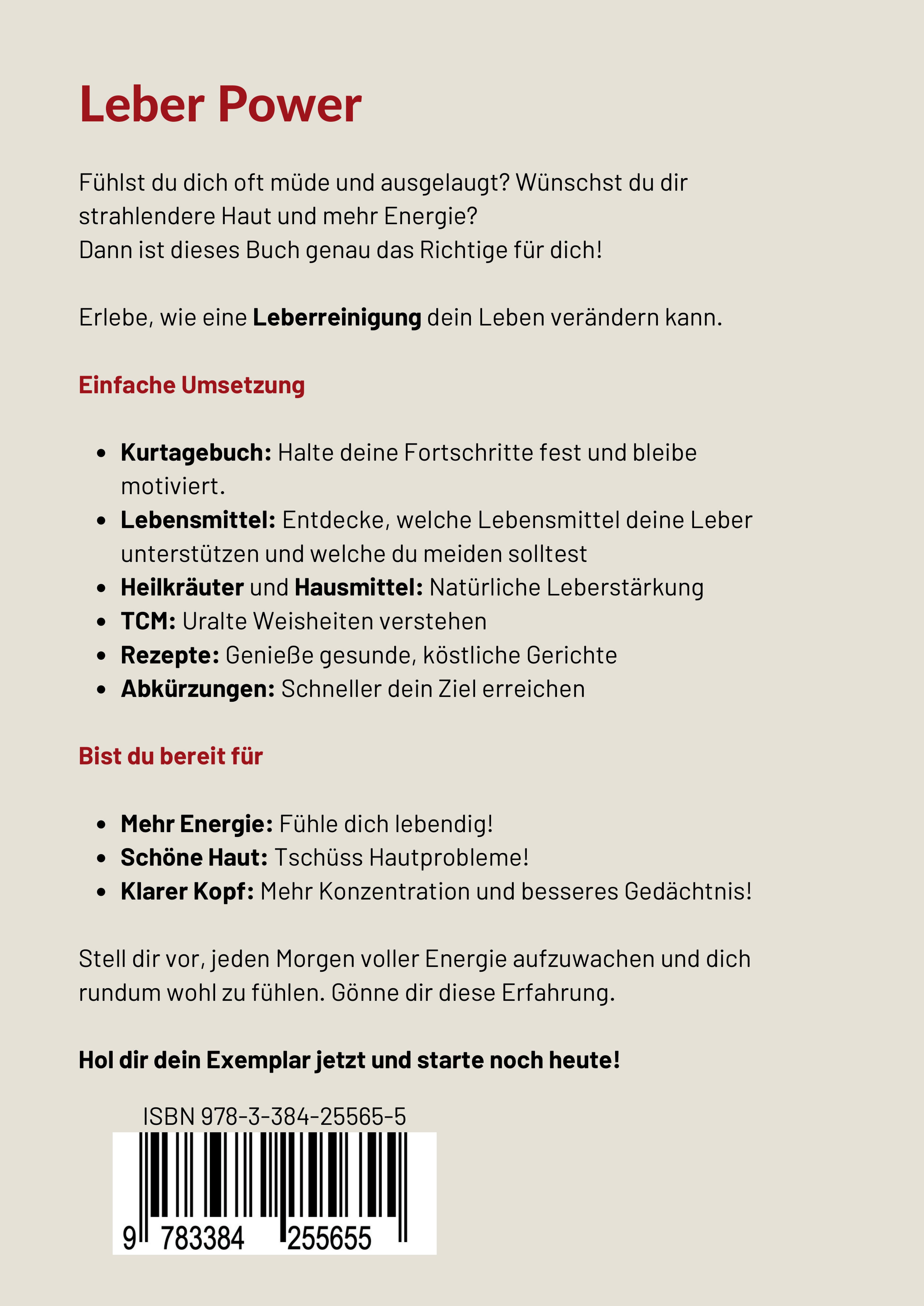 Fühlst du dich oft müde und ausgelaugt? Wünschst du dir strahlendere Haut und mehr Energie? Dann ist dieses Buch genau das Richtige für dich!Erlebe, wie eine Leberreinigung dein Leben verändern kann.Einfache UmsetzungKurtagebuch: Halte deine Fortschritte fest und bleibe motiviert.Lebensmittel: Entdecke, welche Lebensmittel deine Leber unterstützen und welche du meiden solltestHeilkräuter und Hausmittel: Natürliche LeberstärkungTCM: Uralte Weisheiten verstehenRezepte: Genieße gesunde, köstliche GerichteAbkürzungen: Schneller dein Ziel erreichen mit der Neuro-Code TechnologieBist du bereit fürMehr Energie: Fühle dich lebendig!Schöne Haut: Tschüss Hautprobleme!Klarer Kopf: Mehr Konzentration und besseres Gedächtnis!Stell dir vor, jeden Morgen voller Energie aufzuwachen und dich rundum wohl zu fühlen. Gönne dir diese Erfahrung.Hol dir dein Exemplar jetzt und starte noch heute!