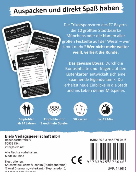 ✓ 50 München-Themenkarten – Welche Bezirke kennst du? Wer kann mehr Nomen aus „Skandal im Sperrbezirk“ nennen? ✓ Bonusinhalte für neue Einblicke – Erzählt, was euch mit einem Stadtbezirk verbindet, oder teilt eure Erinnerungen an die Wiesn. ✓ Kompakt und immer spielbereit – Perfekt für Spieleabende zuhause oder im Biergarten. ✓ Ab 14 Jahren geeignet – Für Münchner und alle, die es werden wollen.