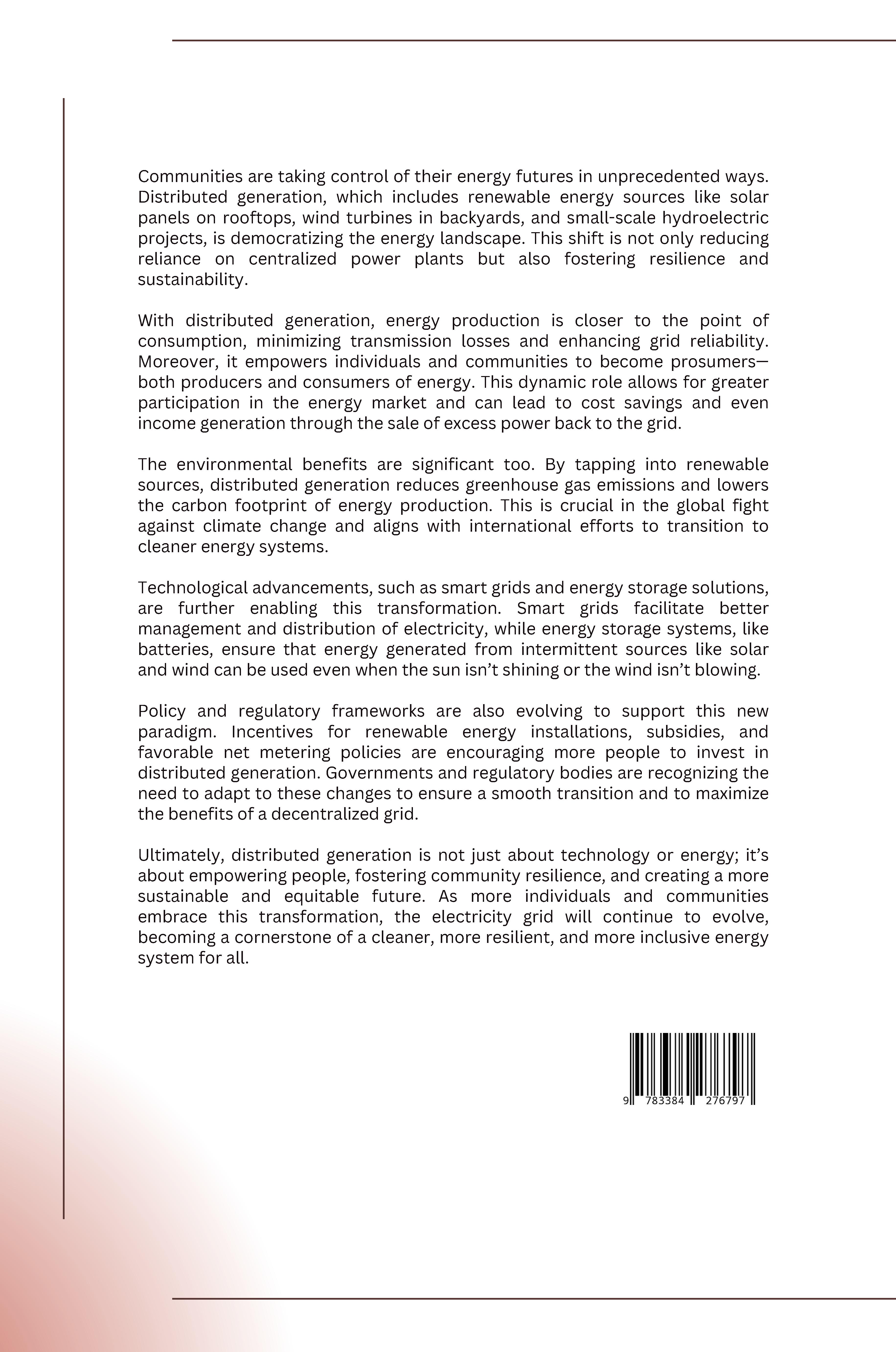 The traditional, centralized power grid faces a revolution. "Power to the People" explores the rise of distributed generation (DG), where homes and businesses become mini power plants. Solar panels, wind turbines, and other renewable technologies are taking center stage. This book dives into the benefits of DG, like cleaner energy, reduced reliance on fossil fuels, and increased grid resilience. Discover how DG empowers communities, creates a more participatory energy system, and paves the way for a more sustainable future. It's a call to action for a transformed electricity grid, putting the power back in the people's hands.