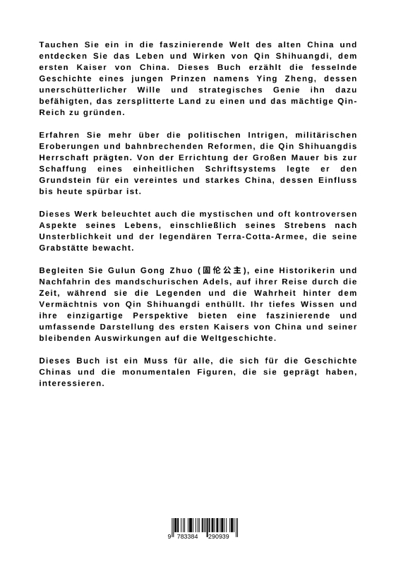 Tauchen Sie ein in die faszinierende Welt des alten China und entdecken Sie das Leben und Wirken von Qin Shihuangdi, dem ersten Kaiser von China. Dieses Buch erzählt die fesselnde Geschichte eines jungen Prinzen namens Ying Zheng, dessen unerschütterlicher Wille und strategisches Genie ihn dazu befähigten, das zersplitterte Land zu einen und das mächtige Qin-Reich zu gründen.Erfahren Sie mehr über die politischen Intrigen, militärischen Eroberungen und bahnbrechenden Reformen, die Qin Shihuangdis Herrschaft prägten. Von der Errichtung der Großen Mauer bis zur Schaffung eines einheitlichen Schriftsystems legte er den Grundstein für ein vereintes und starkes China, dessen Einfluss bis heute spürbar ist.Dieses Werk beleuchtet auch die mystischen und oft kontroversen Aspekte seines Lebens, einschließlich seines Strebens nach Unsterblichkeit und der legendären Terra-Cotta-Armee, die seine Grabstätte bewacht.Begleiten Sie Gulun Gong Zhuo ( ), eine Historikerin und Nachfahrin des mandschurischen Adels, auf ihrer Reise durch die Zeit, während sie die Legenden und die Wahrheit hinter dem Vermächtnis von Qin Shihuangdi enthüllt. Ihr tiefes Wissen und ihre einzigartige Perspektive bieten eine faszinierende und umfassende Darstellung des ersten Kaisers von China und seiner bleibenden Auswirkungen auf die Weltgeschichte.Dieses Buch ist ein Muss für alle, die sich für die Geschichte Chinas und die monumentalen Figuren, die sie geprägt haben, interessieren.