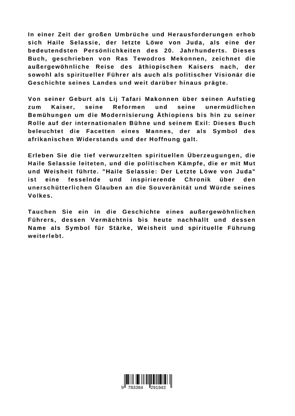 In einer Zeit der großen Umbrüche und Herausforderungen erhob sich Haile Selassie, der letzte Löwe von Juda, als eine der bedeutendsten Persönlichkeiten des 20. Jahrhunderts. Dieses Buch, geschrieben von Ras Tewodros Mekonnen, zeichnet die außergewöhnliche Reise des äthiopischen Kaisers nach, der sowohl als spiritueller Führer als auch als politischer Visionär die Geschichte seines Landes und weit darüber hinaus prägte.Von seiner Geburt als Lij Tafari Makonnen über seinen Aufstieg zum Kaiser, seine Reformen und seine unermüdlichen Bemühungen um die Modernisierung Äthiopiens bis hin zu seiner Rolle auf der internationalen Bühne und seinem Exil: Dieses Buch beleuchtet die Facetten eines Mannes, der als Symbol des afrikanischen Widerstands und der Hoffnung galt.Erleben Sie die tief verwurzelten spirituellen Überzeugungen, die Haile Selassie leiteten, und die politischen Kämpfe, die er mit Mut und Weisheit führte. "Haile Selassie: Der Letzte Löwe von Juda" ist eine fesselnde und inspirierende Chronik über den unerschütterlichen Glauben an die Souveränität und Würde seines Volkes.Tauchen Sie ein in die Geschichte eines außergewöhnlichen Führers, dessen Vermächtnis bis heute nachhallt und dessen Name als Symbol für Stärke, Weisheit und spirituelle Führung weiterlebt.