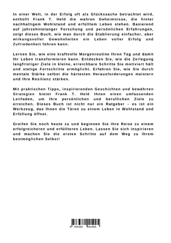 In einer Welt, in der Erfolg oft als Glückssache betrachtet wird, enthüllt Frank T. Held die wahren Geheimnisse, die hinter nachhaltigem Wohlstand und erfülltem Leben stehen. Basierend auf jahrzehntelanger Forschung und persönlichen Erfahrungen, zeigt dieses Buch, wie man durch die Etablierung einfacher, aber wirkungsvoller Gewohnheiten ein Leben voller Erfolg und Zufriedenheit führen kann.Lernen Sie, wie eine kraftvolle Morgenroutine Ihren Tag und damit Ihr Leben transformieren kann. Entdecken Sie, wie die Zerlegung langfristiger Ziele in kleine, erreichbare Schritte Sie motiviert hält und stetige Fortschritte ermöglicht. Erfahren Sie, wie Sie durch mentale Stärke selbst die härtesten Herausforderungen meistern und Ihre Resilienz stärken.Mit praktischen Tipps, inspirierenden Geschichten und bewährten Strategien bietet Frank T. Held Ihnen einen umfassenden Leitfaden, um Ihre persönlichen und beruflichen Ziele zu erreichen. Dieses Buch ist nicht nur ein Ratgeber - es ist ein Werkzeug, das Ihnen die Türen zu einem Leben in Wohlstand und Erfüllung öffnet.Greifen Sie noch heute zu und beginnen Sie Ihre Reise zu einem erfolgreicheren und erfüllteren Leben. Lassen Sie sich inspirieren und machen Sie die ersten Schritte auf dem Weg zu Ihrem bestmöglichen Selbst!