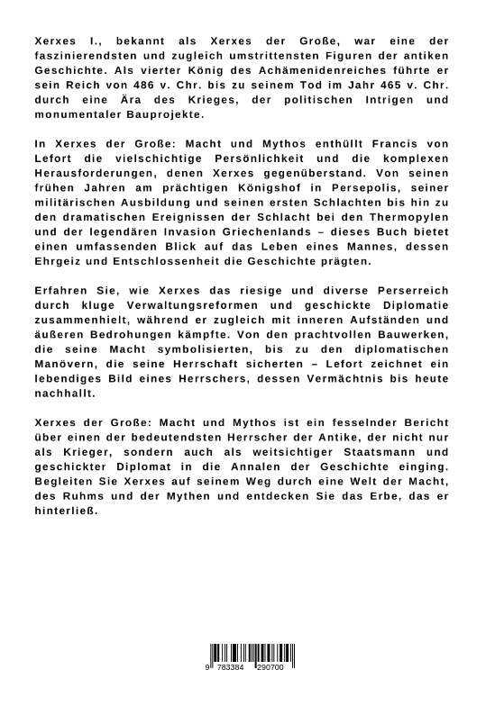 Xerxes I., bekannt als Xerxes der Große, war eine der faszinierendsten und zugleich umstrittensten Figuren der antiken Geschichte. Als vierter König des Achämenidenreiches führte er sein Reich von 486 v. Chr. bis zu seinem Tod im Jahr 465 v. Chr. durch eine Ära des Krieges, der politischen Intrigen und monumentaler Bauprojekte.In Xerxes der Große: Macht und Mythos enthüllt Francis von Lefort die vielschichtige Persönlichkeit und die komplexen Herausforderungen, denen Xerxes gegenüberstand. Von seinen frühen Jahren am prächtigen Königshof in Persepolis, seiner militärischen Ausbildung und seinen ersten Schlachten bis hin zu den dramatischen Ereignissen der Schlacht bei den Thermopylen und der legendären Invasion Griechenlands - dieses Buch bietet einen umfassenden Blick auf das Leben eines Mannes, dessen Ehrgeiz und Entschlossenheit die Geschichte prägten.Erfahren Sie, wie Xerxes das riesige und diverse Perserreich durch kluge Verwaltungsreformen und geschickte Diplomatie zusammenhielt, während er zugleich mit inneren Aufständen und äußeren Bedrohungen kämpfte. Von den prachtvollen Bauwerken, die seine Macht symbolisierten, bis zu den diplomatischen Manövern, die seine Herrschaft sicherten - Lefort zeichnet ein lebendiges Bild eines Herrschers, dessen Vermächtnis bis heute nachhallt.Xerxes der Große: Macht und Mythos ist ein fesselnder Bericht über einen der bedeutendsten Herrscher der Antike, der nicht nur als Krieger, sondern auch als weitsichtiger Staatsmann und geschickter Diplomat in die Annalen der Geschichte einging. Begleiten Sie Xerxes auf seinem Weg durch eine Welt der Macht, des Ruhms und der Mythen und entdecken Sie das Erbe, das er hinterließ.