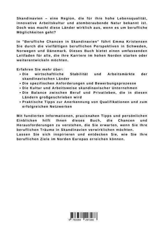 Skandinavien - eine Region, die für ihre hohe Lebensqualität, innovative Arbeitskultur und atemberaubende Natur bekannt ist. Doch was macht diese Länder wirklich aus, wenn es um berufliche Möglichkeiten geht?In "Berufliche Chancen in Skandinavien" führt Emma Kristensen Sie durch die vielfältigen beruflichen Perspektiven in Schweden, Norwegen und Dänemark. Dieses Buch bietet einen umfassenden Leitfaden für alle, die ihre Karriere im hohen Norden starten oder weiterentwickeln möchten.Erfahren Sie mehr über:Die wirtschaftliche Stabilität und Arbeitsmärkte der skandinavischen LänderDie spezifischen Anforderungen und BewerbungsprozesseDie Kultur und Arbeitsweise skandinavischer UnternehmenDie Balance zwischen Beruf und Privatleben, die in diesen Ländern großgeschrieben wirdPraktische Tipps zur Anerkennung von Qualifikationen und zum erfolgreichen NetzwerkenMit fundierten Informationen, praxisnahen Tipps und persönlichen Einblicken hilft Ihnen dieses Buch, die Chancen und Herausforderungen zu verstehen, die Sie erwarten, wenn Sie Ihre beruflichen Träume in Skandinavien verwirklichen möchten.Lassen Sie sich inspirieren und entdecken Sie, wie Sie Ihre beruflichen Ziele im Norden Europas erreichen können.