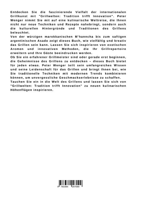 Entdecken Sie die faszinierende Vielfalt der internationalen Grillkunst mit "Grillwelten: Tradition trifft Innovation". Peter Wenger nimmt Sie mit auf eine kulinarische Weltreise, die Ihnen nicht nur neue Techniken und Rezepte nahebringt, sondern auch die kulturellen Hintergründe und Traditionen des Grillens beleuchtet.Von der würzigen marokkanischen M'hanncha bis zum saftigen argentinischen Asado zeigt dieses Buch, wie vielfältig und kreativ das Grillen sein kann. Lassen Sie sich inspirieren von exotischen Aromen und innovativen Methoden, die Ihr Grillrepertoire erweitern und Ihre Gäste beeindrucken werden.Ob Sie ein erfahrener Grillmeister sind oder gerade erst beginnen, die Geheimnisse des Grillens zu entdecken - dieses Buch bietet für jeden etwas. Peter Wenger teilt sein umfangreiches Wissen und seine Leidenschaft für das Grillen und bringt Ihnen bei, wie Sie traditionelle Techniken mit modernen Trends kombinieren können, um unvergessliche Geschmackserlebnisse zu schaffen.Tauchen Sie ein in die Welt des Grillens und lassen Sie sich von "Grillwelten: Tradition trifft Innovation" zu neuen kulinarischen Höhenflügen inspirieren.