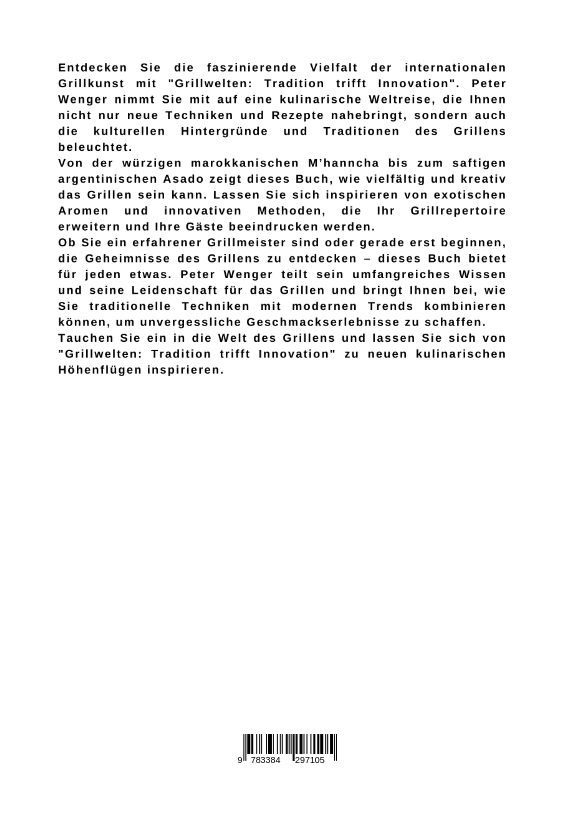 Entdecken Sie die faszinierende Vielfalt der internationalen Grillkunst mit "Grillwelten: Tradition trifft Innovation". Peter Wenger nimmt Sie mit auf eine kulinarische Weltreise, die Ihnen nicht nur neue Techniken und Rezepte nahebringt, sondern auch die kulturellen Hintergründe und Traditionen des Grillens beleuchtet.Von der würzigen marokkanischen M'hanncha bis zum saftigen argentinischen Asado zeigt dieses Buch, wie vielfältig und kreativ das Grillen sein kann. Lassen Sie sich inspirieren von exotischen Aromen und innovativen Methoden, die Ihr Grillrepertoire erweitern und Ihre Gäste beeindrucken werden.Ob Sie ein erfahrener Grillmeister sind oder gerade erst beginnen, die Geheimnisse des Grillens zu entdecken - dieses Buch bietet für jeden etwas. Peter Wenger teilt sein umfangreiches Wissen und seine Leidenschaft für das Grillen und bringt Ihnen bei, wie Sie traditionelle Techniken mit modernen Trends kombinieren können, um unvergessliche Geschmackserlebnisse zu schaffen.Tauchen Sie ein in die Welt des Grillens und lassen Sie sich von "Grillwelten: Tradition trifft Innovation" zu neuen kulinarischen Höhenflügen inspirieren.