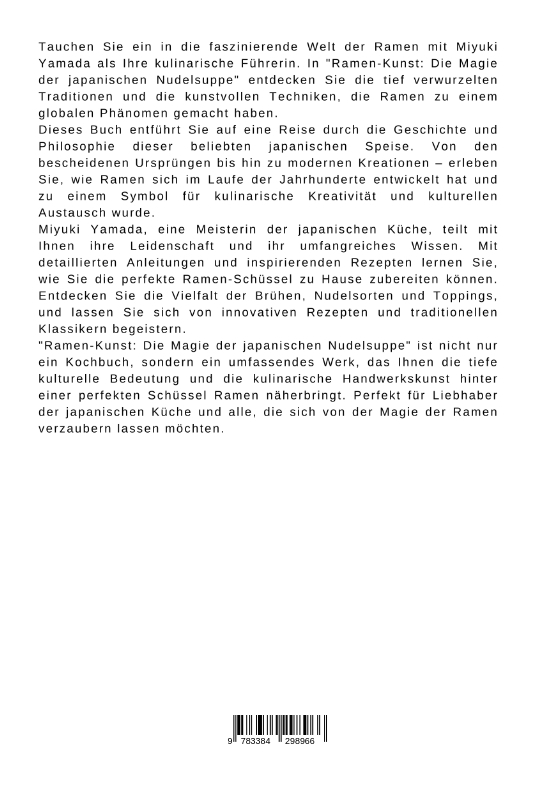Tauchen Sie ein in die faszinierende Welt der Ramen mit Miyuki Yamada als Ihre kulinarische Führerin. In "Ramen-Kunst: Die Magie der japanischen Nudelsuppe" entdecken Sie die tief verwurzelten Traditionen und die kunstvollen Techniken, die Ramen zu einem globalen Phänomen gemacht haben.Dieses Buch entführt Sie auf eine Reise durch die Geschichte und Philosophie dieser beliebten japanischen Speise. Von den bescheidenen Ursprüngen bis hin zu modernen Kreationen - erleben Sie, wie Ramen sich im Laufe der Jahrhunderte entwickelt hat und zu einem Symbol für kulinarische Kreativität und kulturellen Austausch wurde.Miyuki Yamada, eine Meisterin der japanischen Küche, teilt mit Ihnen ihre Leidenschaft und ihr umfangreiches Wissen. Mit detaillierten Anleitungen und inspirierenden Rezepten lernen Sie, wie Sie die perfekte Ramen-Schüssel zu Hause zubereiten können. Entdecken Sie die Vielfalt der Brühen, Nudelsorten und Toppings, und lassen Sie sich von innovativen Rezepten und traditionellen Klassikern begeistern."Ramen-Kunst: Die Magie der japanischen Nudelsuppe" ist nicht nur ein Kochbuch, sondern ein umfassendes Werk, das Ihnen die tiefe kulturelle Bedeutung und die kulinarische Handwerkskunst hinter einer perfekten Schüssel Ramen näherbringt. Perfekt für Liebhaber der japanischen Küche und alle, die sich von der Magie der Ramen verzaubern lassen möchten.
