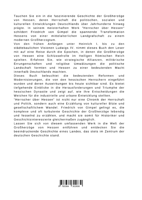 Tauchen Sie ein in die faszinierende Geschichte der Großherzöge von Hessen, deren Herrschaft die politischen, sozialen und kulturellen Entwicklungen Deutschlands über Jahrhunderte hinweg prägte. In seinem meisterhaften Werk "Herrscher über Hessen" schildert Friedrich von Gimpel die spannende Transformation Hessens von einer mittelalterlichen Landgrafschaft zu einem modernen Großherzogtum.Von den frühen Anfängen unter Heinrich I. bis zu den städtebaulichen Visionen Ludwigs IV. nimmt dieses Buch den Leser mit auf eine Reise durch die Epochen, in denen die Großherzöge von Hessen eine Schlüsselrolle im Heiligen Römischen Reich spielten. Erfahren Sie, wie strategische Allianzen, militärische Errungenschaften und religiöse Umwälzungen die politische Landschaft formten und Hessen zu einer bedeutenden Macht innerhalb Deutschlands machten.Dieses Buch beleuchtet die bedeutenden Reformen und Modernisierungen, die von den hessischen Herrschern eingeführt wurden und deren Auswirkungen bis heute sichtbar sind. Es bietet tiefgehende Einblicke in die Herausforderungen und Triumphe der hessischen Dynastie und zeigt auf, wie ihre Entscheidungen die Weichen für die industrielle und urbane Entwicklung stellten."Herrscher über Hessen" ist nicht nur eine Chronik der Herrschaft und Politik, sondern auch eine Erzählung von kultureller Blüte und gesellschaftlichem Wandel. Friedrich von Gimpel gelingt es, die komplexe und oft turbulente Geschichte der Großherzöge lebendig und fesselnd zu erzählen, und macht sie somit für Historiker und Geschichtsinteressierte gleichermaßen zugänglich.Lassen Sie sich von diesem umfassenden Werk in die Welt der Großherzöge von Hessen entführen und entdecken Sie die beeindruckende Geschichte eines Landes, das stets im Zentrum der deutschen Geschichte stand.