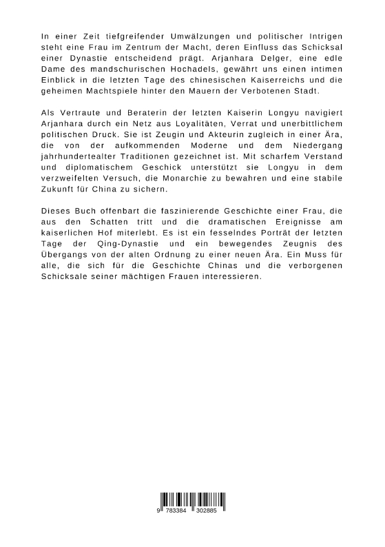 In einer Zeit tiefgreifender Umwälzungen und politischer Intrigen steht eine Frau im Zentrum der Macht, deren Einfluss das Schicksal einer Dynastie entscheidend prägt. Arjanhara Delger, eine edle Dame des mandschurischen Hochadels, gewährt uns einen intimen Einblick in die letzten Tage des chinesischen Kaiserreichs und die geheimen Machtspiele hinter den Mauern der Verbotenen Stadt.Als Vertraute und Beraterin der letzten Kaiserin Longyu navigiert Arjanhara durch ein Netz aus Loyalitäten, Verrat und unerbittlichem politischen Druck. Sie ist Zeugin und Akteurin zugleich in einer Ära, die von der aufkommenden Moderne und dem Niedergang jahrhundertealter Traditionen gezeichnet ist. Mit scharfem Verstand und diplomatischem Geschick unterstützt sie Longyu in dem verzweifelten Versuch, die Monarchie zu bewahren und eine stabile Zukunft für China zu sichern.Dieses Buch offenbart die faszinierende Geschichte einer Frau, die aus den Schatten tritt und die dramatischen Ereignisse am kaiserlichen Hof miterlebt. Es ist ein fesselndes Porträt der letzten Tage der Qing-Dynastie und ein bewegendes Zeugnis des Übergangs von der alten Ordnung zu einer neuen Ära. Ein Muss für alle, die sich für die Geschichte Chinas und die verborgenen Schicksale seiner mächtigen Frauen interessieren.