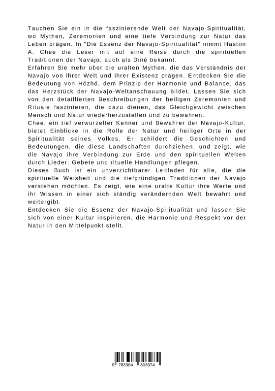 Tauchen Sie ein in die faszinierende Welt der Navajo-Spiritualität, wo Mythen, Zeremonien und eine tiefe Verbindung zur Natur das Leben prägen. In "Die Essenz der Navajo-Spiritualität" nimmt Hastiin A. Chee die Leser mit auf eine Reise durch die spirituellen Traditionen der Navajo, auch als Diné bekannt.Erfahren Sie mehr über die uralten Mythen, die das Verständnis der Navajo von ihrer Welt und ihrer Existenz prägen. Entdecken Sie die Bedeutung von Hózhó, dem Prinzip der Harmonie und Balance, das das Herzstück der Navajo-Weltanschauung bildet. Lassen Sie sich von den detaillierten Beschreibungen der heiligen Zeremonien und Rituale faszinieren, die dazu dienen, das Gleichgewicht zwischen Mensch und Natur wiederherzustellen und zu bewahren.Chee, ein tief verwurzelter Kenner und Bewahrer der Navajo-Kultur, bietet Einblicke in die Rolle der Natur und heiliger Orte in der Spiritualität seines Volkes. Er schildert die Geschichten und Bedeutungen, die diese Landschaften durchziehen, und zeigt, wie die Navajo ihre Verbindung zur Erde und den spirituellen Welten durch Lieder, Gebete und rituelle Handlungen pflegen.Dieses Buch ist ein unverzichtbarer Leitfaden für alle, die die spirituelle Weisheit und die tiefgründigen Traditionen der Navajo verstehen möchten. Es zeigt, wie eine uralte Kultur ihre Werte und ihr Wissen in einer sich ständig verändernden Welt bewahrt und weitergibt.Entdecken Sie die Essenz der Navajo-Spiritualität und lassen Sie sich von einer Kultur inspirieren, die Harmonie und Respekt vor der Natur in den Mittelpunkt stellt.