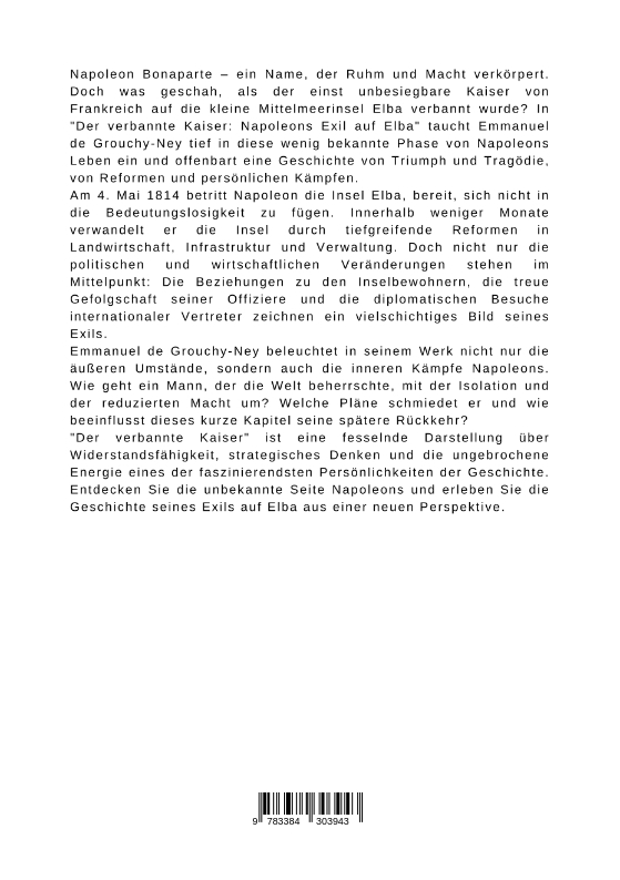 Napoleon Bonaparte - ein Name, der Ruhm und Macht verkörpert. Doch was geschah, als der einst unbesiegbare Kaiser von Frankreich auf die kleine Mittelmeerinsel Elba verbannt wurde? In "Der verbannte Kaiser: Napoleons Exil auf Elba" taucht Emmanuel de Grouchy-Ney tief in diese wenig bekannte Phase von Napoleons Leben ein und offenbart eine Geschichte von Triumph und Tragödie, von Reformen und persönlichen Kämpfen.Am 4. Mai 1814 betritt Napoleon die Insel Elba, bereit, sich nicht in die Bedeutungslosigkeit zu fügen. Innerhalb weniger Monate verwandelt er die Insel durch tiefgreifende Reformen in Landwirtschaft, Infrastruktur und Verwaltung. Doch nicht nur die politischen und wirtschaftlichen Veränderungen stehen im Mittelpunkt: Die Beziehungen zu den Inselbewohnern, die treue Gefolgschaft seiner Offiziere und die diplomatischen Besuche internationaler Vertreter zeichnen ein vielschichtiges Bild seines Exils.Emmanuel de Grouchy-Ney beleuchtet in seinem Werk nicht nur die äußeren Umstände, sondern auch die inneren Kämpfe Napoleons. Wie geht ein Mann, der die Welt beherrschte, mit der Isolation und der reduzierten Macht um? Welche Pläne schmiedet er und wie beeinflusst dieses kurze Kapitel seine spätere Rückkehr?"Der verbannte Kaiser" ist eine fesselnde Erzählung über Widerstandsfähigkeit, strategisches Denken und die ungebrochene Energie eines der faszinierendsten Persönlichkeiten der Geschichte. Entdecken Sie die unbekannte Seite Napoleons und erleben Sie die Geschichte seines Exils auf Elba aus einer neuen Perspektive.