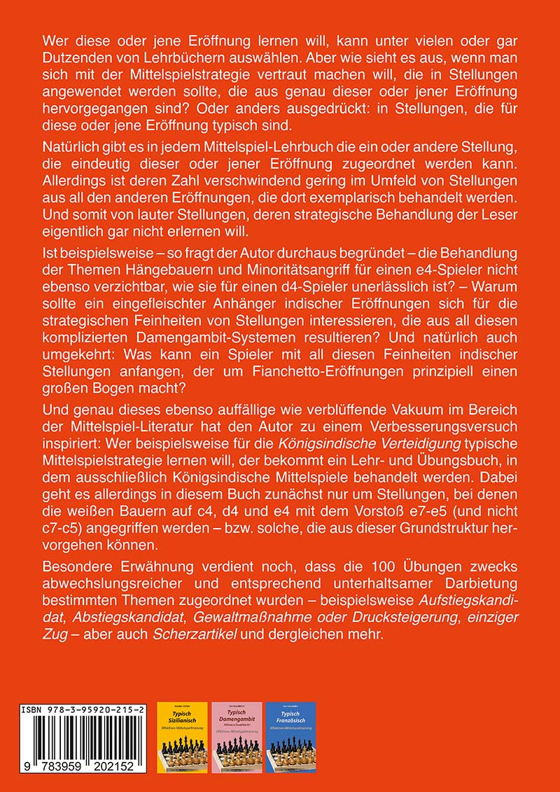 Wer diese oder jene Eröffnung lernen will, kann unter vielen oder gar Dutzenden von Lehrbüchern auswählen. Aber wie sieht es aus, wenn man sich mit der Mittelspielstrategie vertraut machen will, die in Stellungen angewendet werden sollte, die aus genau dieser oder jener Eröffnung hervorgegangen sind? Oder anders ausgedrückt: in Stellungen, die für diese oder jene Eröffnung typisch sind.Natürlich gibt es in jedem Mittelspiel-Lehrbuch die ein oder andere Stellung, die eindeutig dieser oder jener Eröffnung zugeordnet werden kann. Allerdings ist deren Zahl verschwindend gering im Umfeld von Stellungen aus all den anderen Eröffnungen, die dort exemplarisch behandelt werden. Und somit von lauter Stellungen, deren strategische Behandlung der Leser eigentlich gar nicht erlernen will.Ist beispielsweise - so fragt der Autor durchaus begründet - die Behandlung der Themen Hängebauern und Minoritätsangriff für einen e4-Spieler nicht ebenso verzichtbar, wie sie für einen d4-Spieler unerlässlich ist? - Warum sollte ein eingefleischter Anhänger indischer Eröffnungen sich für die strategischen Feinheiten von Stellungen interessieren, die aus all diesen komplizierten Damengambit-Systemen resultieren? Und natürlich auch umgekehrt: Was kann ein Spieler mit all diesen Feinheiten indischer Stellungen anfangen, der um Fianchetto-Eröffnungen prinzipiell einen großen Bogen macht?Und genau dieses ebenso auffällige wie verblüffende Vakuum im Bereich der Mittelspiel-Literatur hat den Autor zu einem Verbesserungsversuch inspiriert: Wer beispielsweise für die Königsindische Verteidigung typische Mittelspielstrategie lernen will, der bekommt ein Lehr- und Übungsbuch, in dem ausschließlich Königsindische Mittelspiele behandelt werden. Dabei geht es allerdings in diesem Buch zunächst nur um Stellungen, bei denen die weißen Bauern auf c4, d4 und e4 mit dem Vorstoß e7-e5 (und nicht c7-c5) angegriffen werden - bzw. solche, die aus dieser Grundstruktur her- vorgehen können.Besondere Erwähnung verdient noch, dass die 100 Übungen zwecks abwechslungsreicher und entsprechend unterhaltsamer Darbietung bestimmten Themen zugeordnet wurden - beispielsweise Aufstiegskandidat, Abstiegskandidat, Gewaltmaßnahme oder Drucksteigerung, einziger Zug - aber auch Scherzartikel und dergleichen mehr.