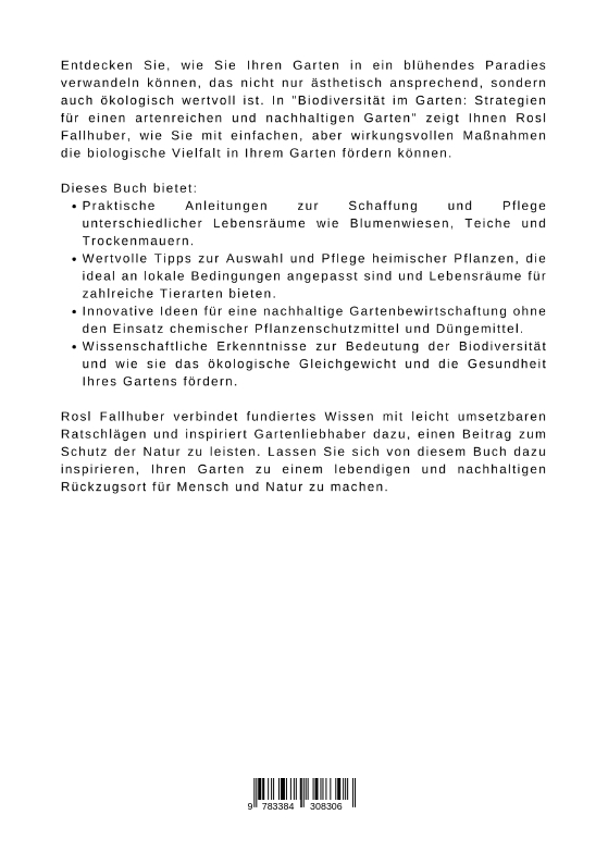 ntdecken Sie, wie Sie Ihren Garten in ein blühendes Paradies verwandeln können, das nicht nur ästhetisch ansprechend, sondern auch ökologisch wertvoll ist. In "Biodiversität im Garten: Strategien für einen artenreichen und nachhaltigen Garten" zeigt Ihnen Rosl Fallhuber, wie Sie mit einfachen, aber wirkungsvollen Maßnahmen die biologische Vielfalt in Ihrem Garten fördern können.Dieses Buch bietet:Praktische Anleitungen zur Schaffung und Pflege unterschiedlicher Lebensräume wie Blumenwiesen, Teiche und Trockenmauern.Wertvolle Tipps zur Auswahl und Pflege heimischer Pflanzen, die ideal an lokale Bedingungen angepasst sind und Lebensräume für zahlreiche Tierarten bieten.Innovative Ideen für eine nachhaltige Gartenbewirtschaftung ohne den Einsatz chemischer Pflanzenschutzmittel und Düngemittel.Wissenschaftliche Erkenntnisse zur Bedeutung der Biodiversität und wie sie das ökologische Gleichgewicht und die Gesundheit Ihres Gartens fördern.Rosl Fallhuber verbindet fundiertes Wissen mit leicht umsetzbaren Ratschlägen und inspiriert Gartenliebhaber dazu, einen Beitrag zum Schutz der Natur zu leisten. Lassen Sie sich von diesem Buch dazu inspirieren, Ihren Garten zu einem lebendigen und nachhaltigen Rückzugsort für Mensch und Natur zu machen.