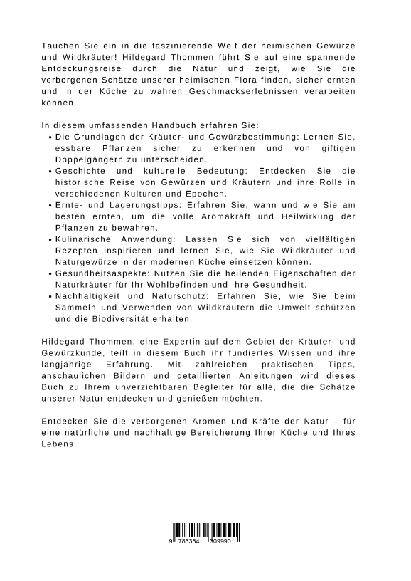 Tauchen Sie ein in die faszinierende Welt der heimischen Gewürze und Wildkräuter! Hildegard Thommen führt Sie auf eine spannende Entdeckungsreise durch die Natur und zeigt, wie Sie die verborgenen Schätze unserer heimischen Flora finden, sicher ernten und in der Küche zu wahren Geschmackserlebnissen verarbeiten können.In diesem umfassenden Handbuch erfahren Sie:Die Grundlagen der Kräuter- und Gewürzbestimmung: Lernen Sie, essbare Pflanzen sicher zu erkennen und von giftigen Doppelgängern zu unterscheiden.Geschichte und kulturelle Bedeutung: Entdecken Sie die historische Reise von Gewürzen und Kräutern und ihre Rolle in verschiedenen Kulturen und Epochen.Ernte- und Lagerungstipps: Erfahren Sie, wann und wie Sie am besten ernten, um die volle Aromakraft und Heilwirkung der Pflanzen zu bewahren.Kulinarische Anwendung: Lassen Sie sich von vielfältigen Rezepten inspirieren und lernen Sie, wie Sie Wildkräuter und Naturgewürze in der modernen Küche einsetzen können.Gesundheitsaspekte: Nutzen Sie die heilenden Eigenschaften der Naturkräuter für Ihr Wohlbefinden und Ihre Gesundheit.Nachhaltigkeit und Naturschutz: Erfahren Sie, wie Sie beim Sammeln und Verwenden von Wildkräutern die Umwelt schützen und die Biodiversität erhalten.Hildegard Thommen, eine Expertin auf dem Gebiet der Kräuter- und Gewürzkunde, teilt in diesem Buch ihr fundiertes Wissen und ihre langjährige Erfahrung. Mit zahlreichen praktischen Tipps, anschaulichen Bildern und detaillierten Anleitungen wird dieses Buch zu Ihrem unverzichtbaren Begleiter für alle, die die Schätze unserer Natur entdecken und genießen möchten.Entdecken Sie die verborgenen Aromen und Kräfte der Natur - für eine natürliche und nachhaltige Bereicherung Ihrer Küche und Ihres Lebens.