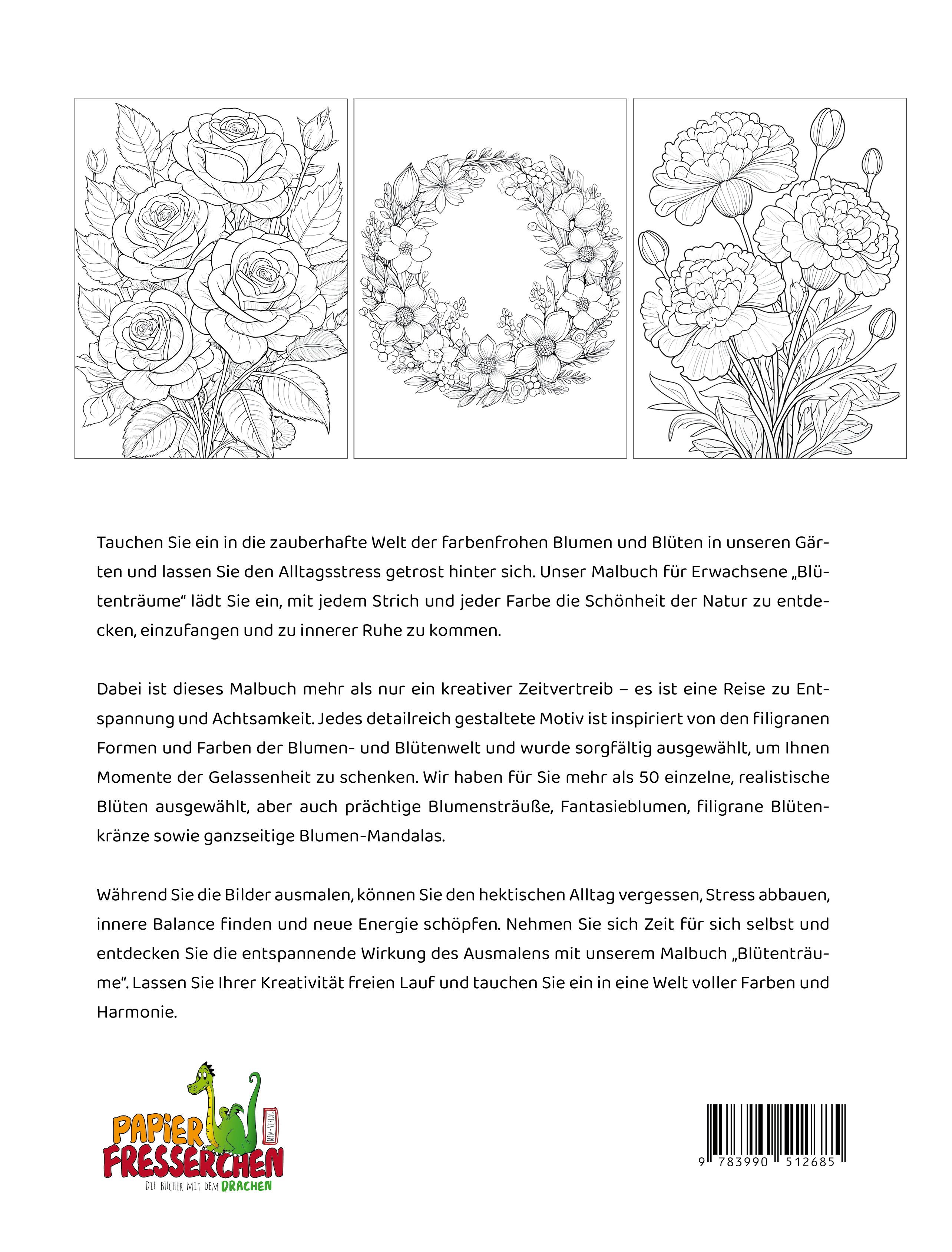 Dabei ist dieses Malbuch mehr als nur ein kreativer Zeitvertreib – es ist eine Reise zu Entspannung und Achtsamkeit. Jedes detailreich gestaltete Motiv ist inspiriert von den filigranen Formen und Farben der Blumen- und Blütenwelt und wurde sorgfältig ausgewählt, um Ihnen Momente der Gelassenheit zu schenken. Wir haben für Sie mehr als 50 einzelne, realistische Blüten ausgewählt, aber auch prächtige Blumensträuße, Fantasieblumen, filigrane Blütenkränze sowie ganzseitige Blumen-Mandalas.