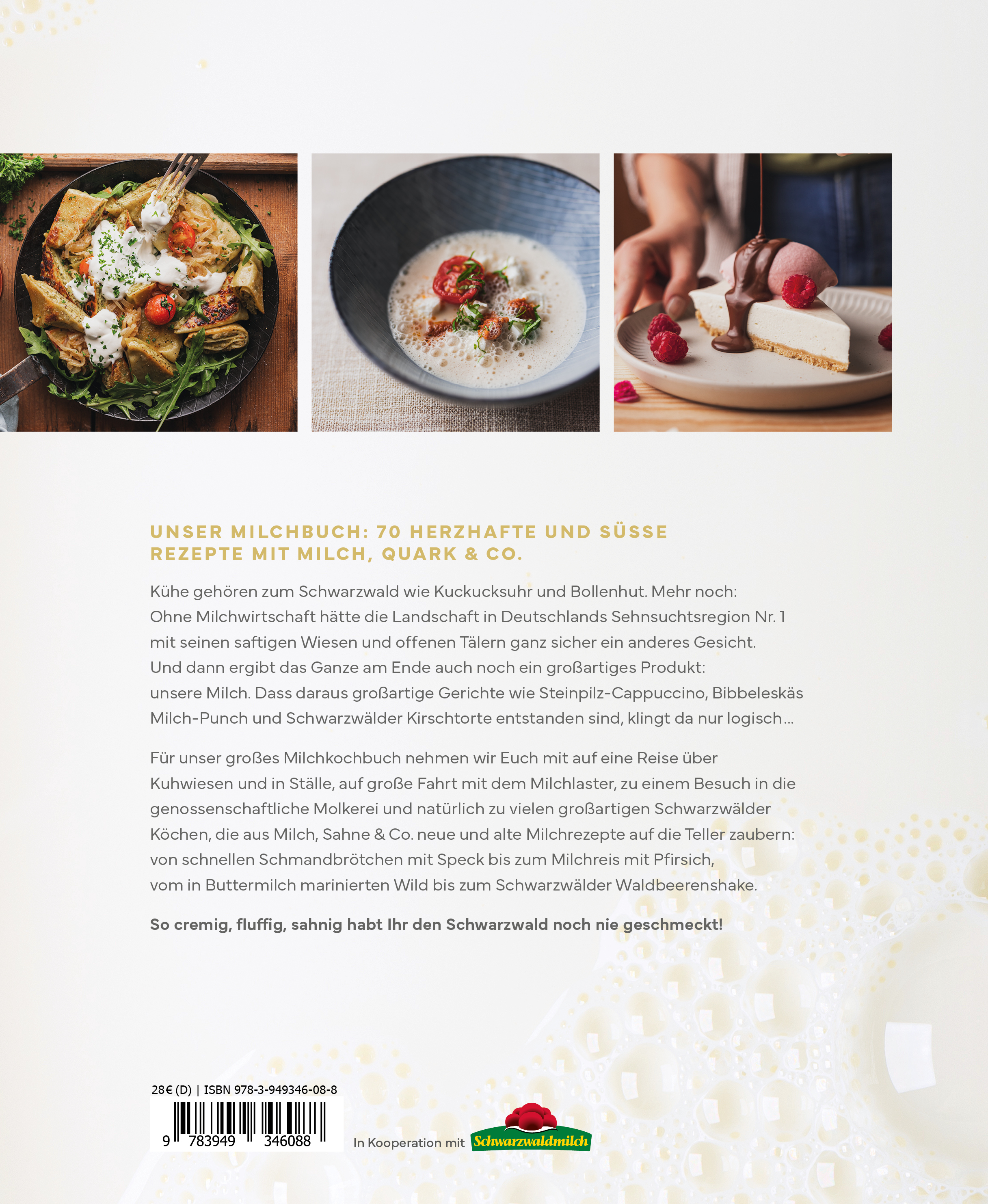 UNSER MILCHBUCH: 70 HERZHAFTE UND SÜSSE REZEPTE MIT MILCH, QUARK & CO.Kühe gehören zum Schwarzwald wie Kuckucksuhr und Bollenhut. Mehr noch: Ohne Milchwirtschaft hätte die Landschaft in Deutschlands Sehnsuchtsregion Nr. 1 mit seinen saftigen Wiesen und offenen Tälern ganz sicher ein anderes Gesicht. Und dann ergibt das Ganze am Ende auch noch ein großartiges Produkt: unsere Milch. Dass daraus großartige Gerichte wie Steinpilz-Cappuccino, Bibbeleskäs Milch-Punch und Schwarzwälder Kirschtorte entstanden sind, klingt da nur logisch ... Für unser großes Milchkochbuch nehmen wir Euch mit auf eine Reise über Kuhwiesen und in Ställe, auf große Fahrt mit dem Milchlaster, zu einem Besuch in die genossenschaftliche Molkerei und natürlich zu vielen großartigen Schwarzwälder Köchen, die aus Milch, Sahne & Co. neue und alte Milchrezepte auf die Teller zaubern: von schnellen Schmandbrötchen mit Speck bis zum Milchreis mit Pfirsich, vom in Buttermilch marinierten Wild bis zum Schwarzwälder Waldbeerenshake. So cremig, fluffig, sahnig habt Ihr den Schwarzwald noch nie geschmeckt!