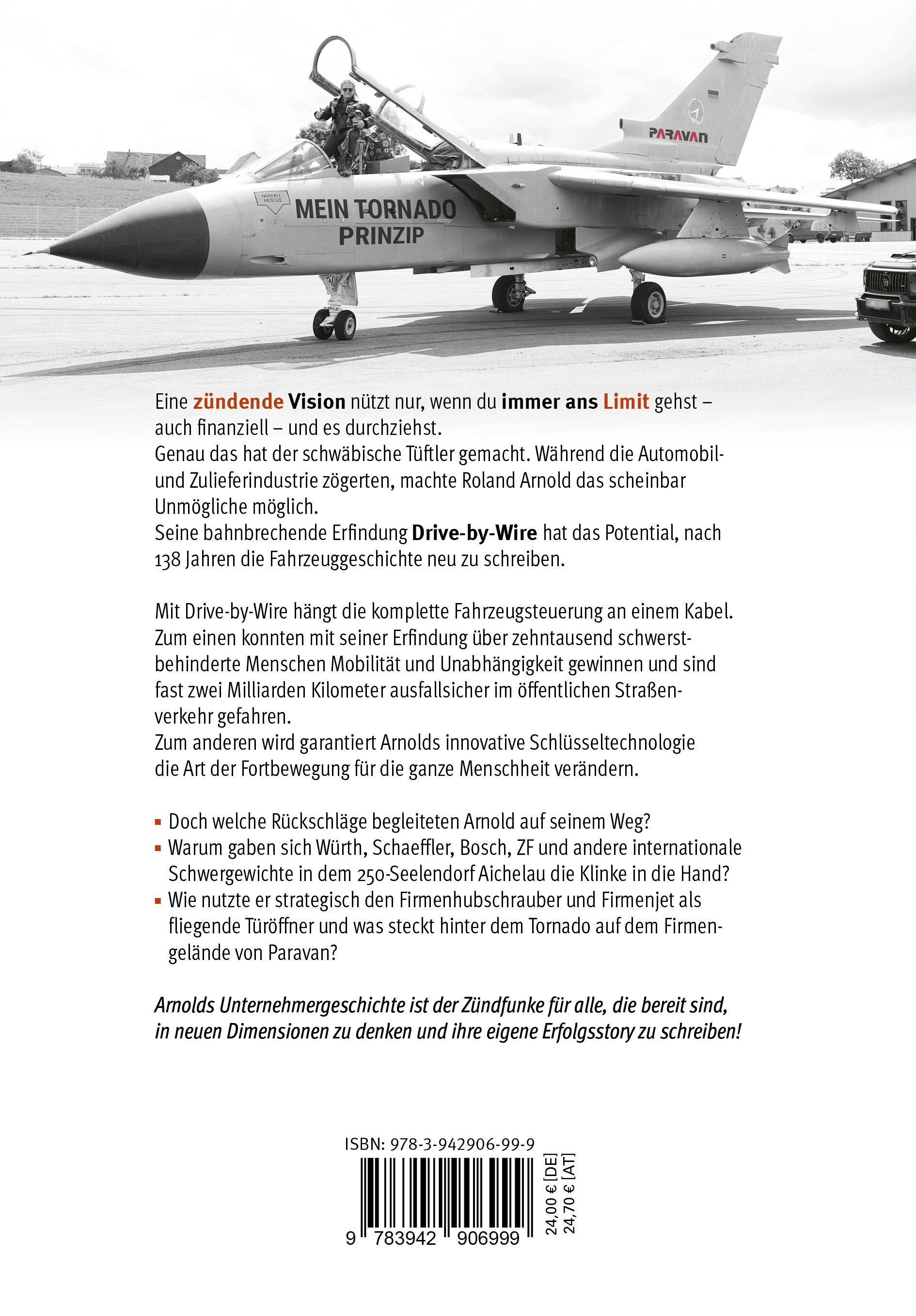Eine zündende Vision nützt nur, wenn du immer ans Limit gehst - auch finanziell - und es durchziehst.Genau das hat der schwäbische Tüftler gemacht. Während die Automobil- und Zulieferindustrie zögerten, machte Roland Arnold das scheinbar Unmögliche möglich.Seine bahnbrechende Erfindung Drive-by-Wire hat das Potential, nach 138 Jahren die Fahrzeuggeschichte neu zu schreiben.Mit Drive-by-Wire hängt die komplette Fahrzeugsteuerung an einem Kabel.Zum einen konnten mit seiner Erfindung über zehntausend schwerstbehinderte Menschen Mobilität und Unabhängigkeit gewinnen und sind fast zwei Milliarden Kilometer ausfallsicher im öffentlichen Straßenverkehr gefahren. Zum anderen wird garantiert Arnolds innovative Schlüsseltechnologie die Art der Fortbewegung für die ganze Menschheit verändern.Doch welche Rückschläge begleiteten Arnold auf seinem Weg?Warum gaben sich Würth, Schaeffler, Bosch, ZF und andere internationale Schwergewichte in dem 250-Seelendorf Aichelau die Klinke in die Hand?Wie nutzte er strategisch den Firmenhubschrauber und Firmenjet als fliegende Türöffner und was steckt hinter dem Tornado auf dem Firmengelände von Paravan?Arnolds Unternehmergeschichte ist der Zündfunke für alle, die bereit sind,in neuen Dimensionen zu denken und ihre eigene Erfolgsstory zu schreiben!