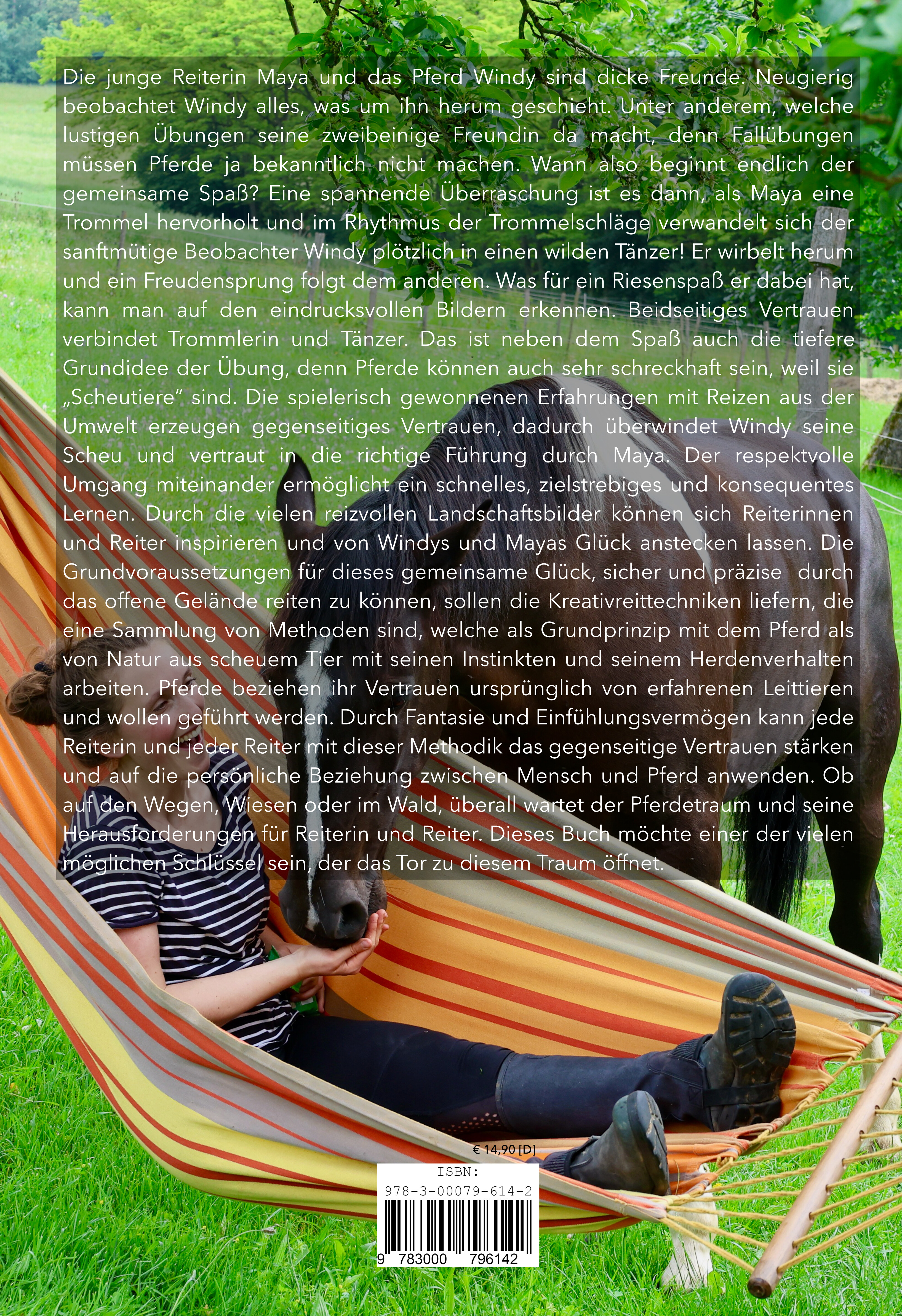 Vertrauen ist die Grundlage für eine Freundschaft. Einander gut zu kennen ist die Grundlage, sich zu vertrauen. Freundschaft bedeutet, auf die Bedürfnisse voneinander einzugehen. Dieses Buch beschreibt eine Möglichkeit, wie du über Vertrauen und Respekt Sicherheit aufbauen kannst. Sicherheit, die du brauchst, um mit einem Meisterläufer- deinem Pferd- auf Augenhöhe und mit viel Spaß im Gelände unterwegs zu sein. Die in diesem Buch aufgeführten Übungen und Kreativreittechniken sind aus dem Wunsch heraus entstanden, sicher sowie präzise und ohne Sattel nur mit Reithalfter im Gelände reiten zu können. Nach über einem Jahrzehnt Praxis und Erfahrung mit vielen verschiedenen Pferden hat sich erwiesen, dass sie in jeder Situation des Freizeitreitens anzuwenden sind. Mit dem Einüben der Techniken und ihrer Anwendung können alle Pferdefreundinnen und Pferdefreunde jeden Alters dem Wunsch, mit ihrem einfühlsamen und sensiblen, zugleich starken und schnellen Partner mit Lebensfreude im Gelände und über Wiesen ohne Sattel und mit Reithalfter zu reiten, einen Galoppsprung näher kommen. Das Pferd Windy präsentiert sich am liebsten in seiner natürlichen Schönheit. Es lässt sich auch gern ohne Sattel reiten, deshalb sind alle Fotos von Windy und seiner Reiterin Maya ohne Sattel. Denn direkt auf dem Pferd zu sitzen, gibt dir das wunderbare Gefühl, „eins zu werden mit deinem Pferd“. Die hier beschriebenen Übungen und Signale können von dir aber auch mit Trense, Sattel oder Reitpad angewendet werden. WICHTIG: Ein Helm schützt deinen Kopf vor schlimmen Verletzungen. Grundsätzlich ist es am besten, wenn du beim Reiten immer einen Helm trägst!