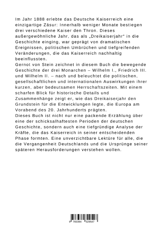 Im Jahr 1888 erlebte das Deutsche Kaiserreich eine einzigartige Zäsur: Innerhalb weniger Monate bestiegen drei verschiedene Kaiser den Thron. Dieses außergewöhnliche Jahr, das als "Dreikaiserjahr" in die Geschichte einging, war geprägt von dramatischen Ereignissen, politischen Umbrüchen und tiefgreifenden Veränderungen, die das Kaiserreich nachhaltig beeinflussten.Gernot von Stein zeichnet in diesem Buch die bewegende Geschichte der drei Monarchen - Wilhelm I., Friedrich III. und Wilhelm II. - nach und beleuchtet die politischen, gesellschaftlichen und internationalen Auswirkungen ihrer kurzen, aber bedeutsamen Herrschaftszeiten. Mit einem scharfen Blick für historische Details und Zusammenhänge zeigt er, wie das Dreikaiserjahr den Grundstein für die Entwicklungen legte, die Europa am Vorabend des 20. Jahrhunderts prägten.Dieses Buch ist nicht nur eine packende Erzählung über eine der schicksalhaftesten Perioden der deutschen Geschichte, sondern auch eine tiefgründige Analyse der Kräfte, die das Kaiserreich in seiner entscheidenden Phase formten. Eine unverzichtbare Lektüre für alle, die die Vergangenheit Deutschlands und die Ursprünge seiner späteren Herausforderungen verstehen wollen.