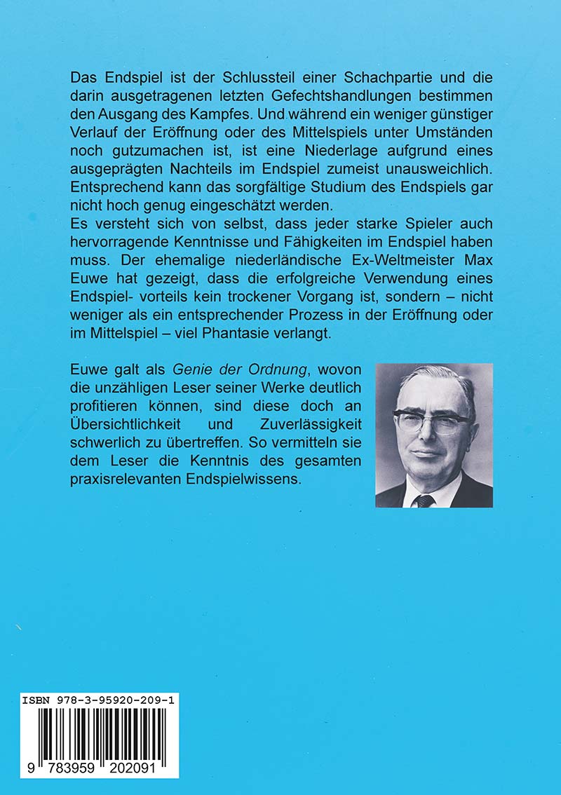 Das Endspiel ist der Schlussteil einer Schachpartie und die darin ausgetragenen letzten Gefechtshandlungen bestimmen den Ausgang des Kampfes. Und während ein weniger günstiger Verlauf der Eröffnung oder des Mittelspiels unter Umständen noch gutzumachen ist, ist eine Niederlage aufgrund eines ausgeprägten Nachteils im Endspiel zumeist unausweichlich. Entsprechend kann das sorgfältige Studium des Endspiels gar nicht hoch genug eingeschätzt werden.Es versteht sich von selbst, dass jeder starke Spieler auch hervorragende Kenntnisse und Fähigkeiten im Endspiel haben muss. Der ehemalige niederländische Ex-Weltmeister Max Euwe hat gezeigt, dass die erfolgreiche Verwendung eines Endspielvorteils kein trockener Vorgang ist, sondern - nicht weniger als ein entsprechender Prozess in der Eröffnung oder im Mittelspiel - viel Phantasie verlangt.
