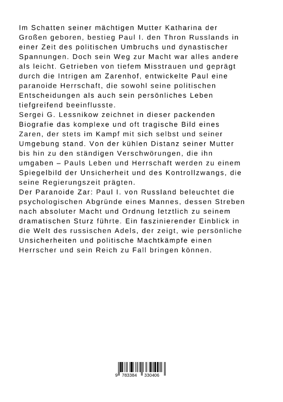 Im Schatten seiner mächtigen Mutter Katharina der Großen geboren, bestieg Paul I. den Thron Russlands in einer Zeit des politischen Umbruchs und dynastischer Spannungen. Doch sein Weg zur Macht war alles andere als leicht. Getrieben von tiefem Misstrauen und geprägt durch die Intrigen am Zarenhof, entwickelte Paul eine paranoide Herrschaft, die sowohl seine politischen Entscheidungen als auch sein persönliches Leben tiefgreifend beeinflusste.Sergei G. Lessnikow zeichnet in dieser packenden Biografie das komplexe und oft tragische Bild eines Zaren, der stets im Kampf mit sich selbst und seiner Umgebung stand. Von der kühlen Distanz seiner Mutter bis hin zu den ständigen Verschwörungen, die ihn umgaben - Pauls Leben und Herrschaft werden zu einem Spiegelbild der Unsicherheit und des Kontrollzwangs, die seine Regierungszeit prägten.Der Paranoide Zar: Paul I. von Russland beleuchtet die psychologischen Abgründe eines Mannes, dessen Streben nach absoluter Macht und Ordnung letztlich zu seinem dramatischen Sturz führte. Ein faszinierender Einblick in die Welt des russischen Adels, der zeigt, wie persönliche Unsicherheiten und politische Machtkämpfe einen Herrscher und sein Reich zu Fall bringen können.