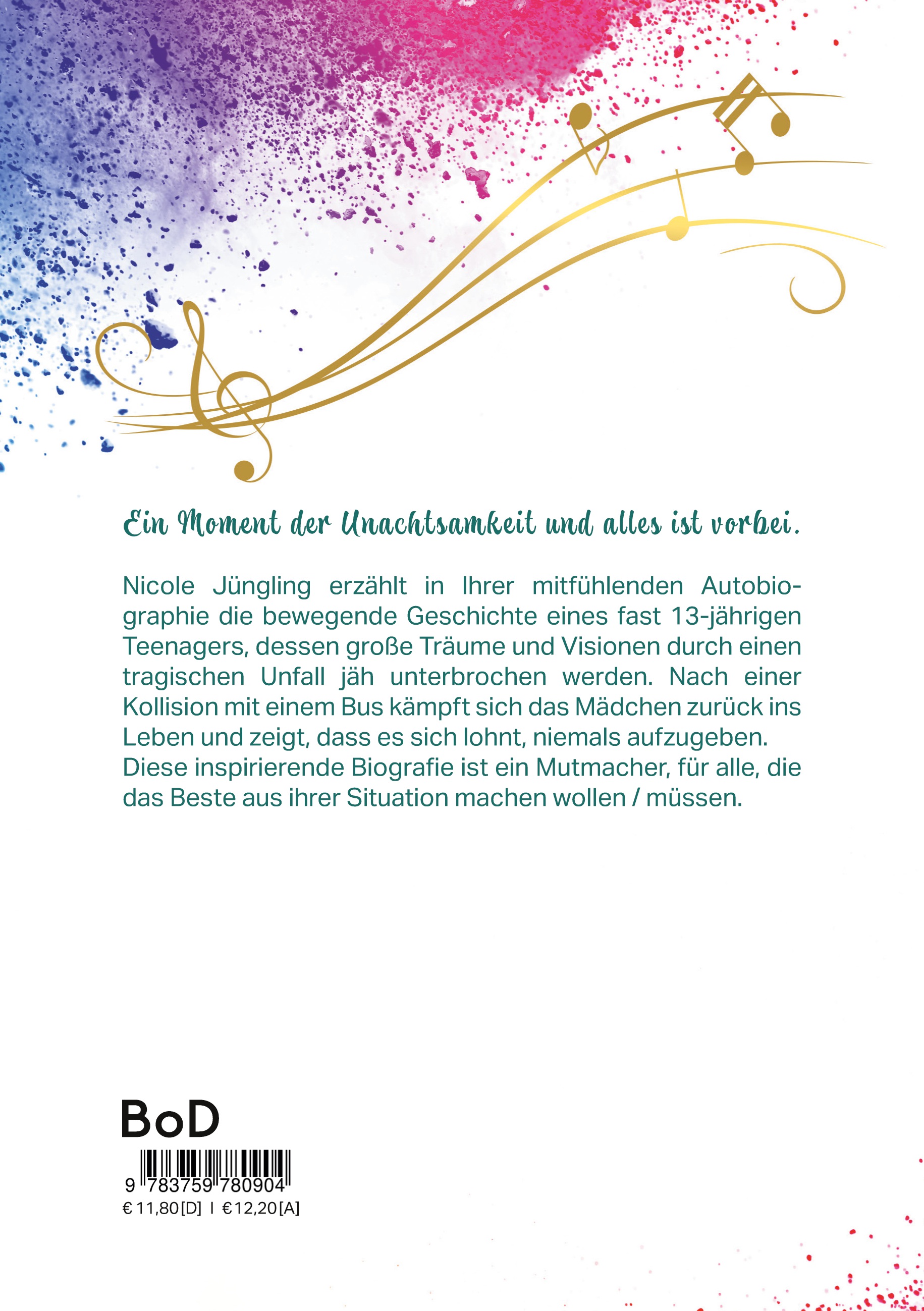Nicole Jüngling erzählt in Ihrer mitfühlenden Autobiographie die bewegende Geschichte eines fast 13-jährigen Teenagers, dessen große Träume und Visionen durch einen tragischen Unfall jäh unterbrochen werden. Nach einer Kollision mit einem Bus kämpft sich das Mädchen zurück ins Leben und zeigt, dass es sich lohnt, niemals aufzugeben.