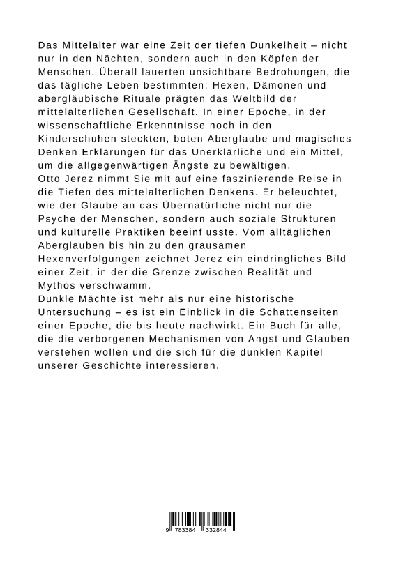 Das Mittelalter war eine Zeit der tiefen Dunkelheit - nicht nur in den Nächten, sondern auch in den Köpfen der Menschen. Überall lauerten unsichtbare Bedrohungen, die das tägliche Leben bestimmten: Hexen, Dämonen und abergläubische Rituale prägten das Weltbild der mittelalterlichen Gesellschaft. In einer Epoche, in der wissenschaftliche Erkenntnisse noch in den Kinderschuhen steckten, boten Aberglaube und magisches Denken Erklärungen für das Unerklärliche und ein Mittel, um die allgegenwärtigen Ängste zu bewältigen.Otto Jerez nimmt Sie mit auf eine faszinierende Reise in die Tiefen des mittelalterlichen Denkens. Er beleuchtet, wie der Glaube an das Übernatürliche nicht nur die Psyche der Menschen, sondern auch soziale Strukturen und kulturelle Praktiken beeinflusste. Vom alltäglichen Aberglauben bis hin zu den grausamen Hexenverfolgungen zeichnet Jerez ein eindringliches Bild einer Zeit, in der die Grenze zwischen Realität und Mythos verschwamm.Dunkle Mächte ist mehr als nur eine historische Untersuchung - es ist ein Einblick in die Schattenseiten einer Epoche, die bis heute nachwirkt. Ein Buch für alle, die die verborgenen Mechanismen von Angst und Glauben verstehen wollen und die sich für die dunklen Kapitel unserer Geschichte interessieren.