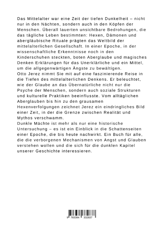 Das Mittelalter war eine Zeit der tiefen Dunkelheit - nicht nur in den Nächten, sondern auch in den Köpfen der Menschen. Überall lauerten unsichtbare Bedrohungen, die das tägliche Leben bestimmten: Hexen, Dämonen und abergläubische Rituale prägten das Weltbild der mittelalterlichen Gesellschaft. In einer Epoche, in der wissenschaftliche Erkenntnisse noch in den Kinderschuhen steckten, boten Aberglaube und magisches Denken Erklärungen für das Unerklärliche und ein Mittel, um die allgegenwärtigen Ängste zu bewältigen.Otto Jerez nimmt Sie mit auf eine faszinierende Reise in die Tiefen des mittelalterlichen Denkens. Er beleuchtet, wie der Glaube an das Übernatürliche nicht nur die Psyche der Menschen, sondern auch soziale Strukturen und kulturelle Praktiken beeinflusste. Vom alltäglichen Aberglauben bis hin zu den grausamen Hexenverfolgungen zeichnet Jerez ein eindringliches Bild einer Zeit, in der die Grenze zwischen Realität und Mythos verschwamm.Dunkle Mächte ist mehr als nur eine historische Untersuchung - es ist ein Einblick in die Schattenseiten einer Epoche, die bis heute nachwirkt. Ein Buch für alle, die die verborgenen Mechanismen von Angst und Glauben verstehen wollen und die sich für die dunklen Kapitel unserer Geschichte interessieren.