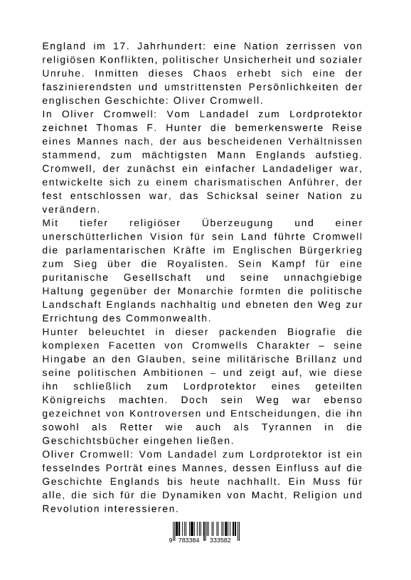 England im 17. Jahrhundert: eine Nation zerrissen von religiösen Konflikten, politischer Unsicherheit und sozialer Unruhe. Inmitten dieses Chaos erhebt sich eine der faszinierendsten und umstrittensten Persönlichkeiten der englischen Geschichte: Oliver Cromwell.In Oliver Cromwell: Vom Landadel zum Lordprotektor zeichnet Thomas F. Hunter die bemerkenswerte Reise eines Mannes nach, der aus bescheidenen Verhältnissen stammend, zum mächtigsten Mann Englands aufstieg. Cromwell, der zunächst ein einfacher Landadeliger war, entwickelte sich zu einem charismatischen Anführer, der fest entschlossen war, das Schicksal seiner Nation zu verändern.Mit tiefer religiöser Überzeugung und einer unerschütterlichen Vision für sein Land führte Cromwell die parlamentarischen Kräfte im Englischen Bürgerkrieg zum Sieg über die Royalisten. Sein Kampf für eine puritanische Gesellschaft und seine unnachgiebige Haltung gegenüber der Monarchie formten die politische Landschaft Englands nachhaltig und ebneten den Weg zur Errichtung des Commonwealth.Hunter beleuchtet in dieser packenden Biografie die komplexen Facetten von Cromwells Charakter - seine Hingabe an den Glauben, seine militärische Brillanz und seine politischen Ambitionen - und zeigt auf, wie diese ihn schließlich zum Lordprotektor eines geteilten Königreichs machten. Doch sein Weg war ebenso gezeichnet von Kontroversen und Entscheidungen, die ihn sowohl als Retter wie auch als Tyrannen in die Geschichtsbücher eingehen ließen.Oliver Cromwell: Vom Landadel zum Lordprotektor ist ein fesselndes Porträt eines Mannes, dessen Einfluss auf die Geschichte Englands bis heute nachhallt. Ein Muss für alle, die sich für die Dynamiken von Macht, Religion und Revolution interessieren.