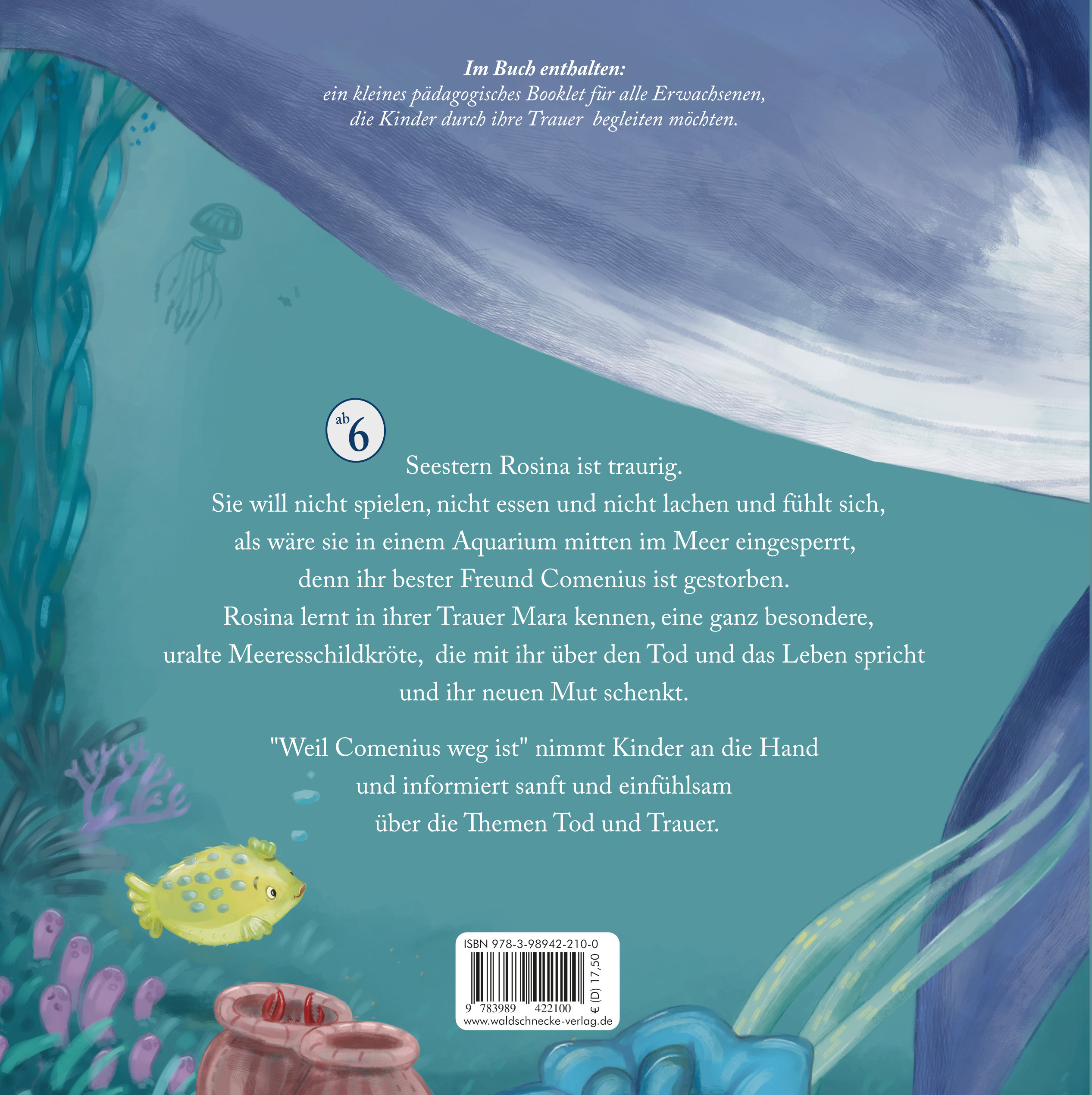 Seestern Rosina ist traurig. Sie will nicht spielen, nicht essen und nicht lachen und fühlt sich, als wäre sie in einem Aquarium mitten im Meer eingesperrt, denn ihr bester Freund Comenius ist gestorben. Rosina lernt in ihrer Trauer Mara kennen, eine ganz besondere, uralte Meeresschildkröte, die mit ihr über den Tod und das Leben spricht und ihr neuen Mut schenkt.