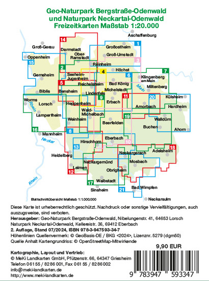 Freizeitkarte im Detailmaßstab 1:20.000 mit allen Wanderwegen und den in der Natur beschilderten Radwanderwegen. Mit den Qualitätswegen und den Hauptwanderwegen des Odenwaldklubs. Ebenso enthalten sind alle kommunalen Rundwanderwege und die Rundwanderwege des Naturparks ausgehend von den Naturpark-Parkplätzen. Auf der Rückseite werden u.a. die Rundwanderwege beschrieben.